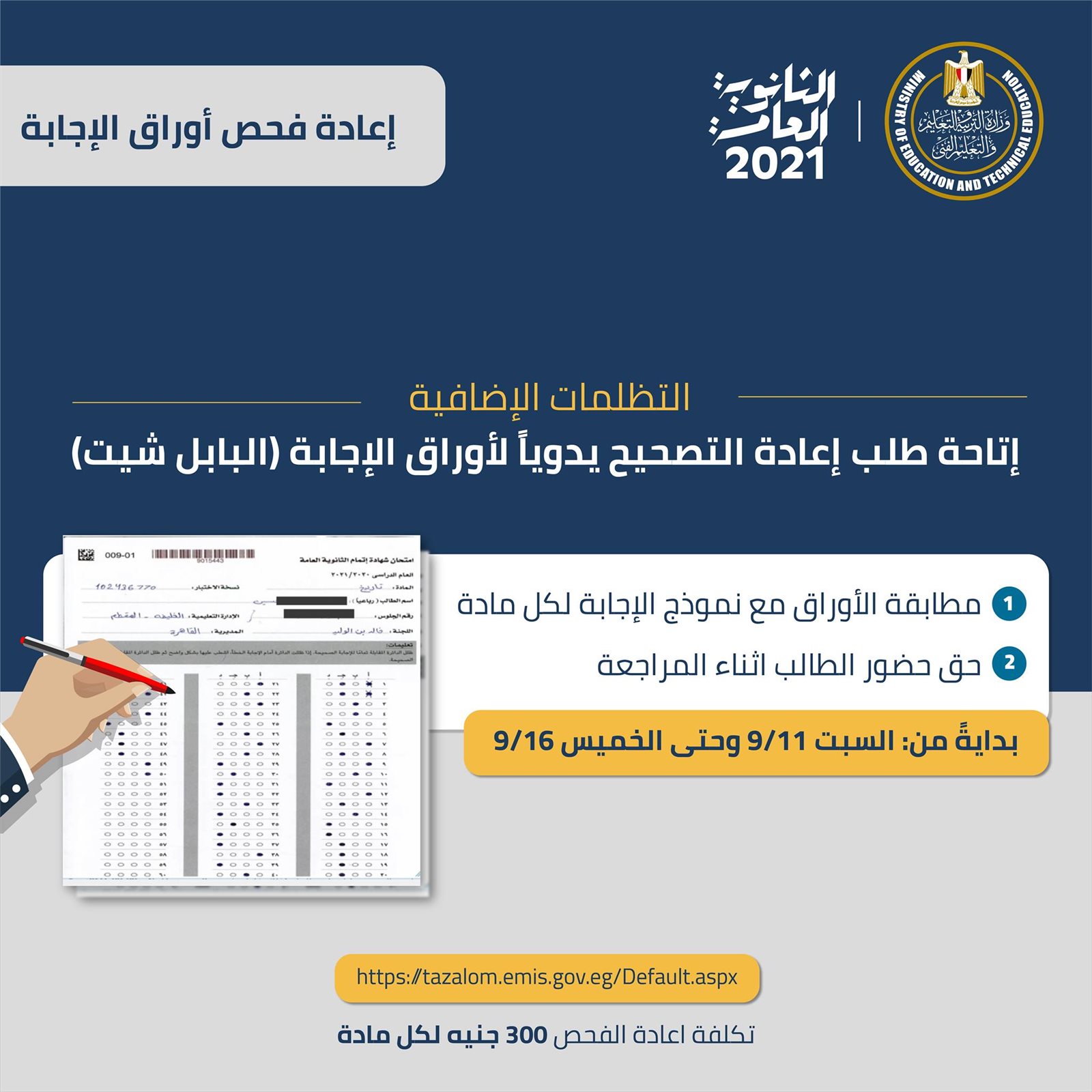 أعلنت وزارة التربية والتعليم والتعليم الفني أنه تلبيةً لرغبة أولياء الأمور والطلاب، يمكن طلب إعادة تصحيح يدوي لأوراق الإجابة (البابل شيت) لامتحانات الثانوية العامة ٢٠٢١.