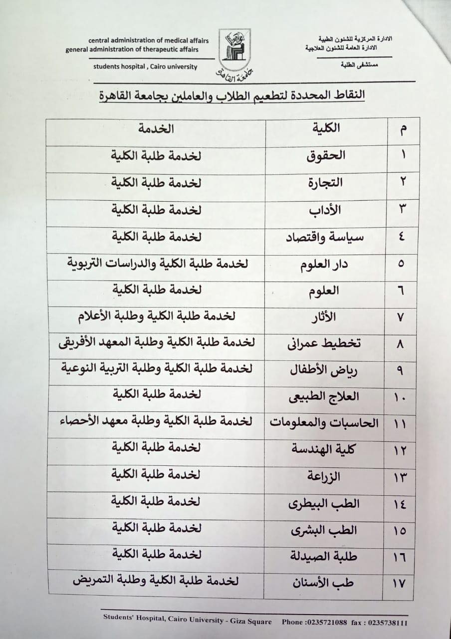 حددت جامعة القاهرة 17 نقطة داخل وخارج الحرم الجامعي لتطعيم الطلاب والعاملين وأعضاء هيئة التدريس بالجامعة، في كليات: الحقوق، والتجارة، والآداب، وسياسة واقتصاد، ودار العلوم، والآثار، والعلوم، والتخطيط الإقليمي والعمراني، ورياض الأطفال، والعلاج الطبيعي، والحاسبات والذكاء الاصطناعي، والهندسة، والزراعة، والطب البيطري، والطب البشرى، والصيدلة، وطب الأسنان، وذلك يوميًا من الساعة التاسعة صباحًا وحتى الثالثة عصرًا.