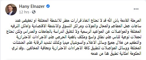 وكتب هاني الناظر تدوينة على الفيس بوك: "المرحلة القادمة بإذن الله قد لا تحتاج اتخاذ قرارات حظر للأنشطة المختلفة أو تخفيض عدد ساعات عمل المطاعم والمحال والمولات ومراكز التسوق والأنشطة الاقتصادية وأماكن الترفيه المختلفة والمواصلات عن المواعيد الرسمية ولا لتعليق الدراسة بالجامعات والمدارس".