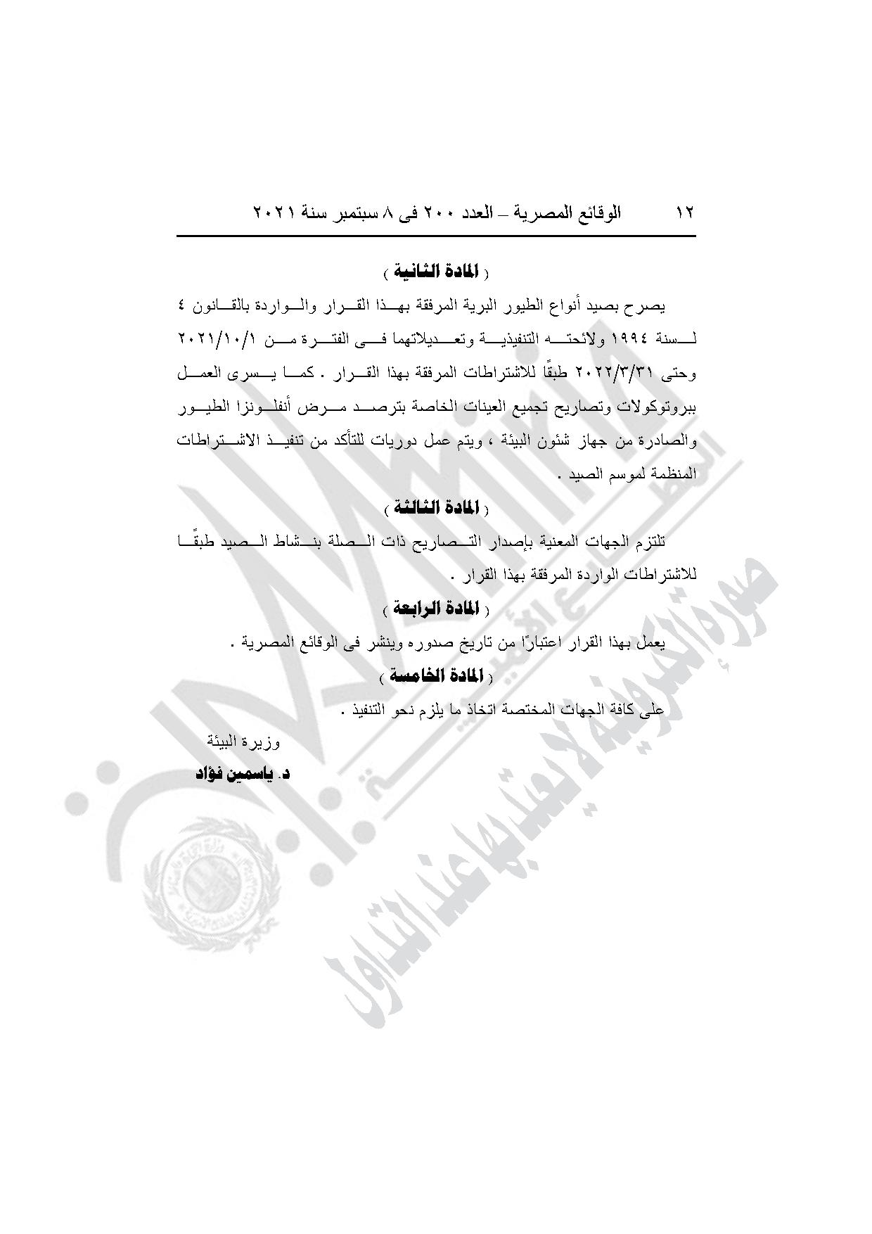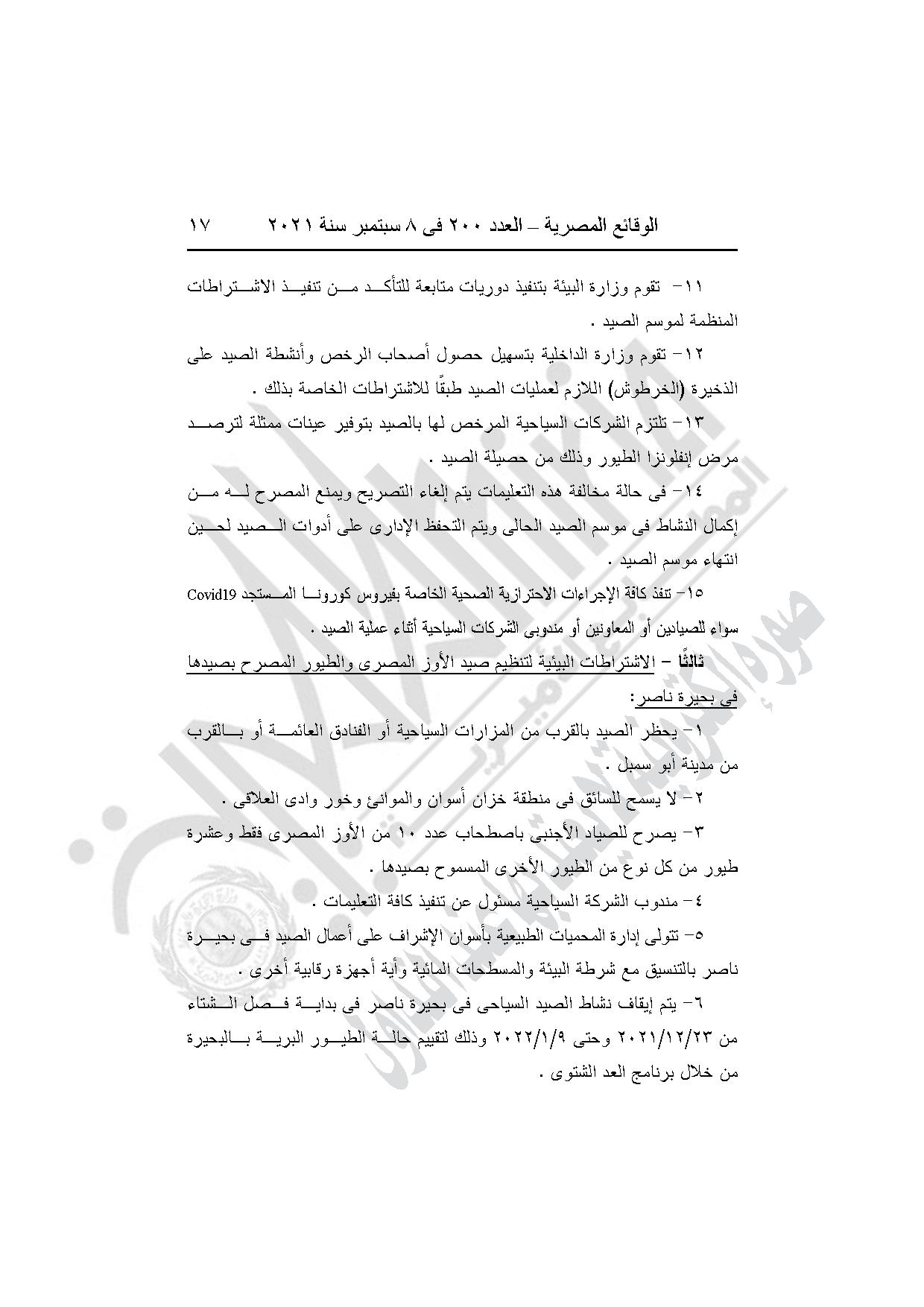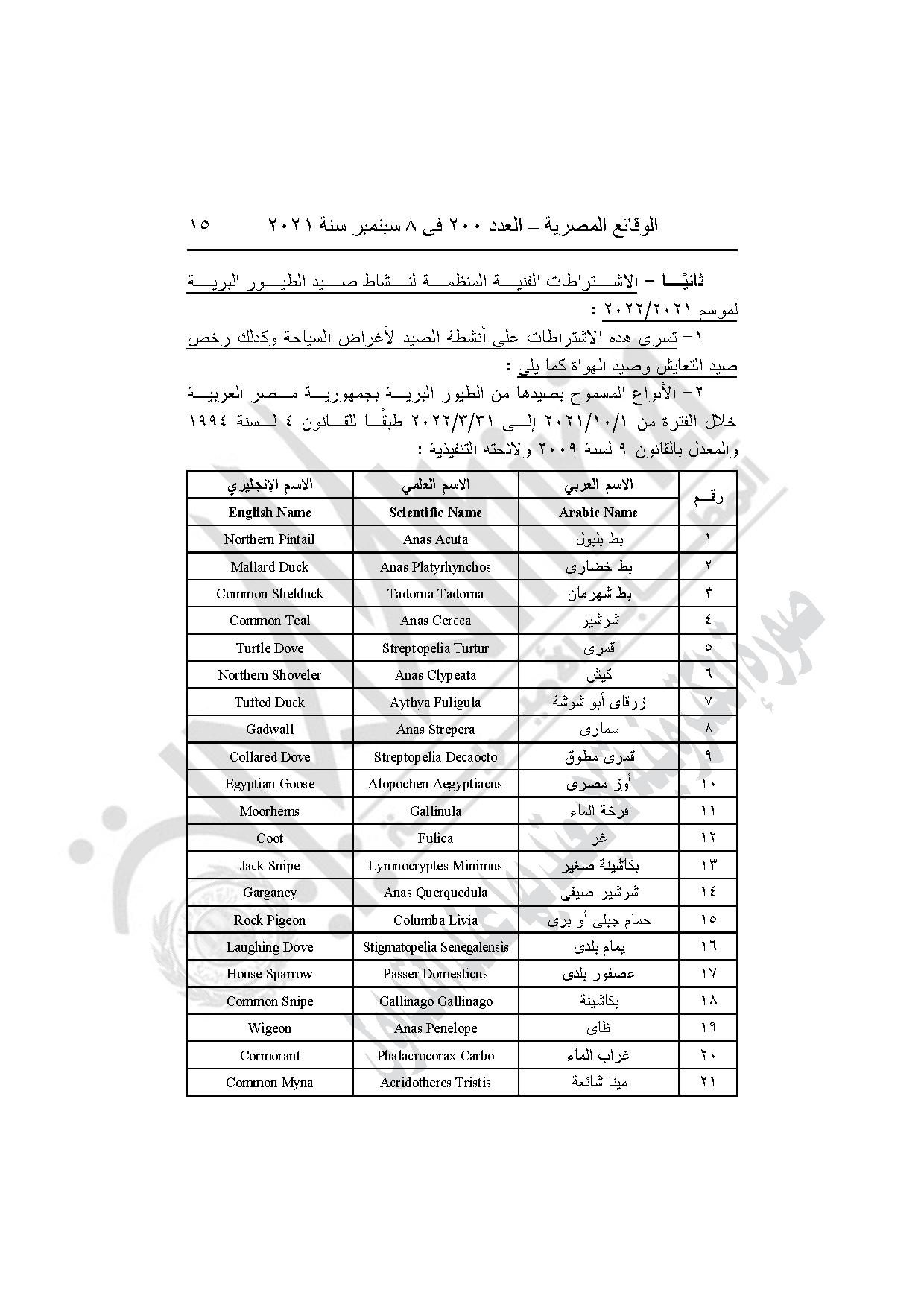 وجاء في المادة الثانية للقرار "يصرح بصيد أنواع الطيور البرية المرفقة بهذا القرار والواردة بالقانون 4 لسنة 1994 ولائحته التنفيذية وتعديلاتهما فى الفترة من 1/10/2021 وحتى 31/3/2022 طبقًا للاشتراطات المرفقة بهذا القرار".