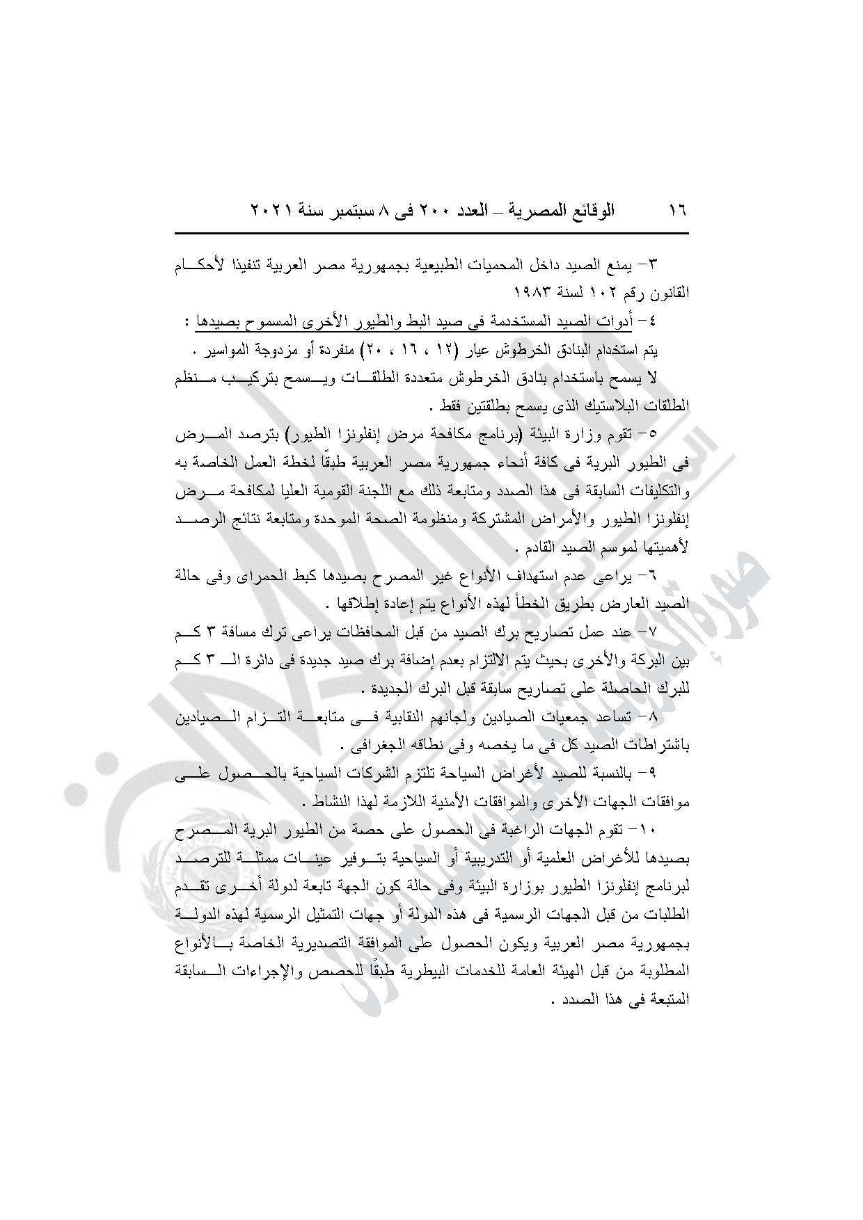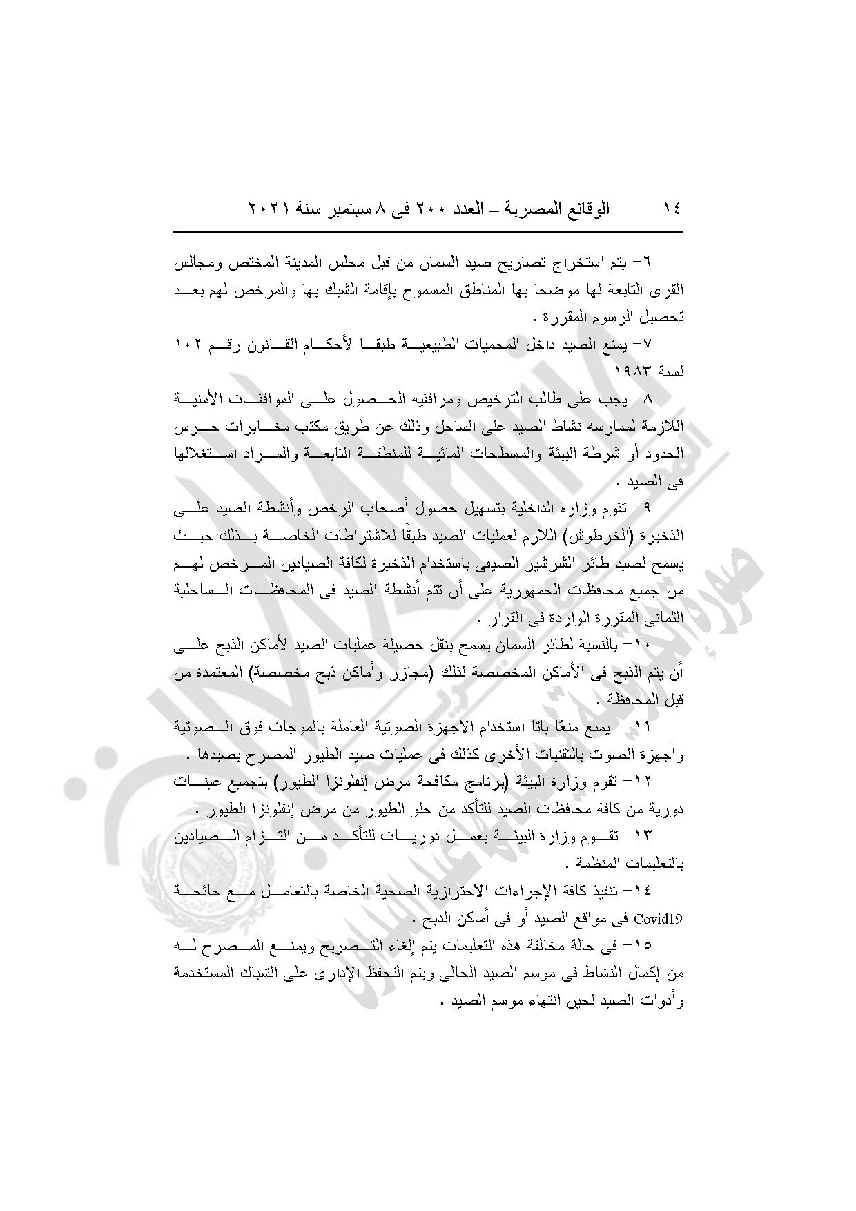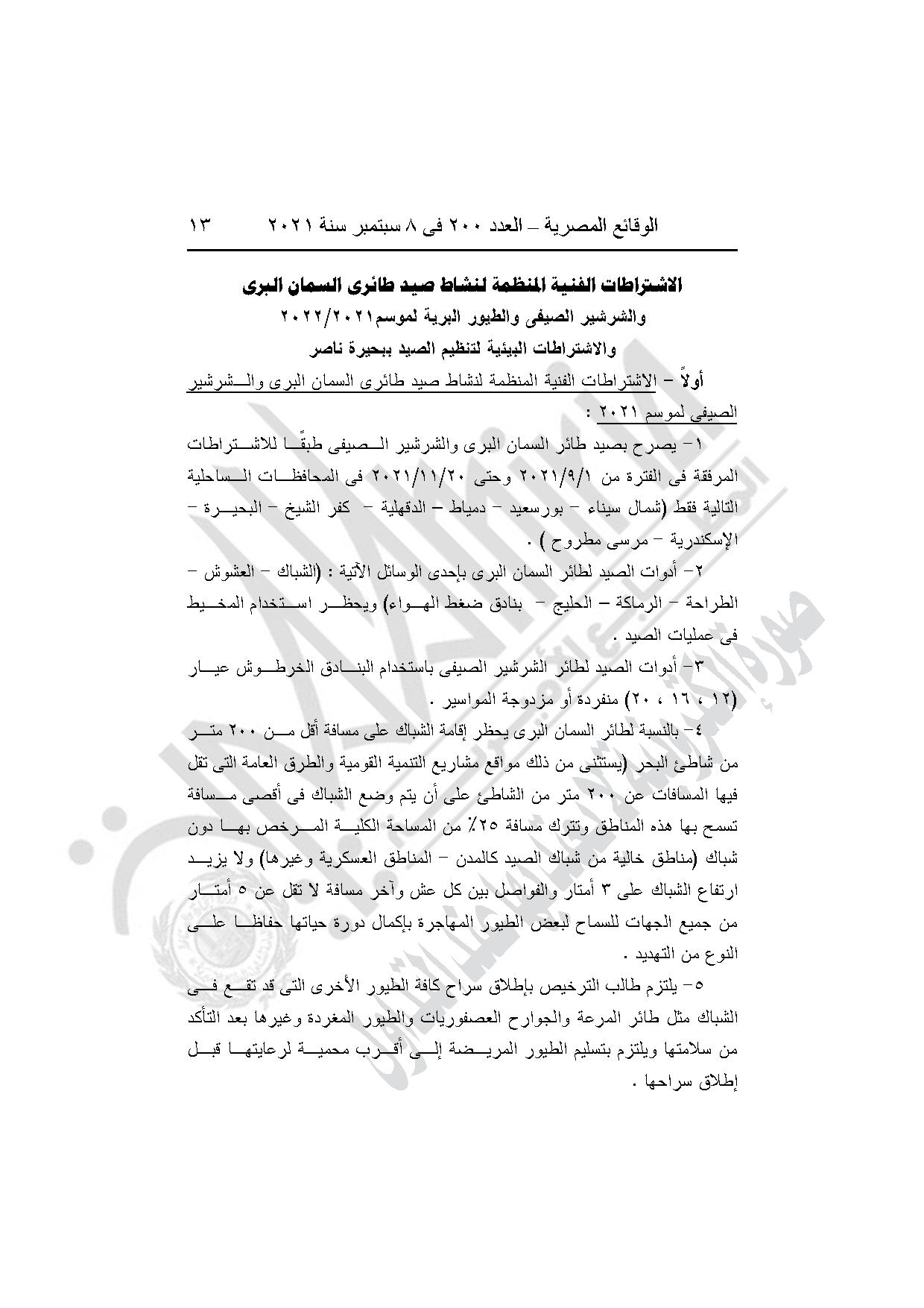 وجاء في المادة الثانية للقرار "يصرح بصيد أنواع الطيور البرية المرفقة بهذا القرار والواردة بالقانون 4 لسنة 1994 ولائحته التنفيذية وتعديلاتهما فى الفترة من 1/10/2021 وحتى 31/3/2022 طبقًا للاشتراطات المرفقة بهذا القرار".