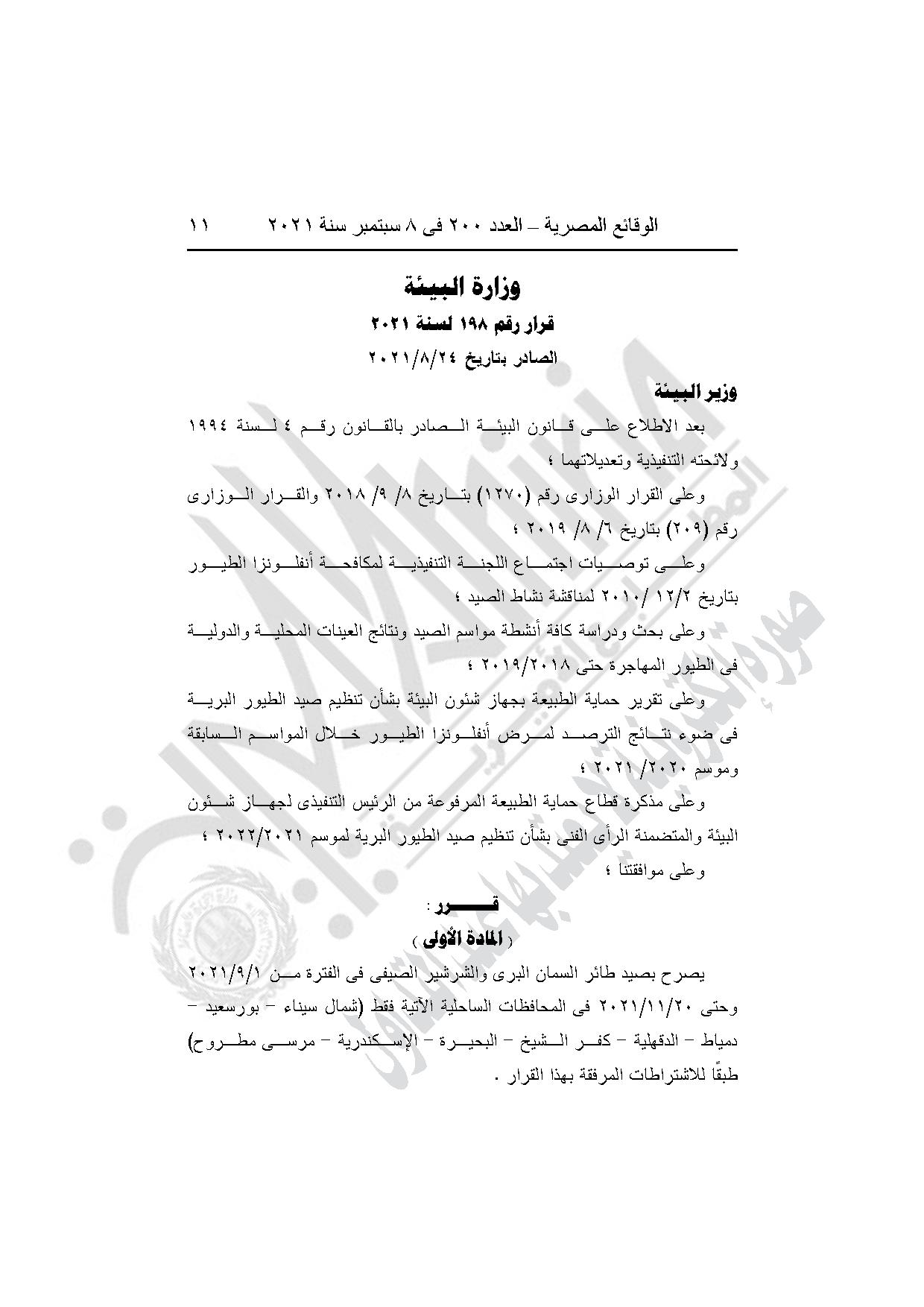 نشرت جريدة الوقائع المصرية في عددها رقم 200، الصادر في 8 سبتمبر 2021، قرار وزارة البيئة رقم 198 لسنة 2021، بشأن التصريح بصيد طائر السمان البرى والشرشير الصيفى فى المحافظات الساحلية الآتية فقط (شمال سيناء- بورسعيد- دمياط- الدقهلية- كفر الشيخ- البحيرة- الإسكندرية- مرسى مطروح) طبقًا للاشتراطات.