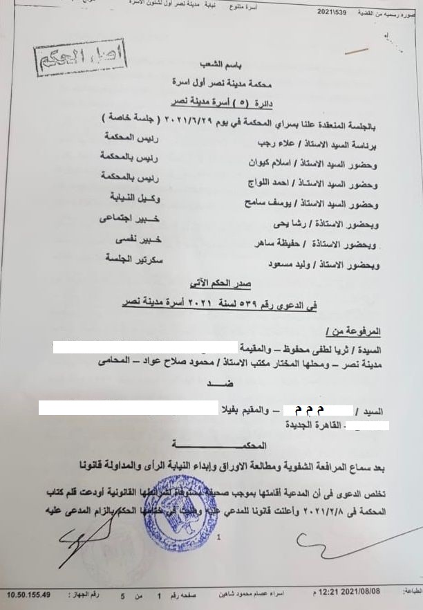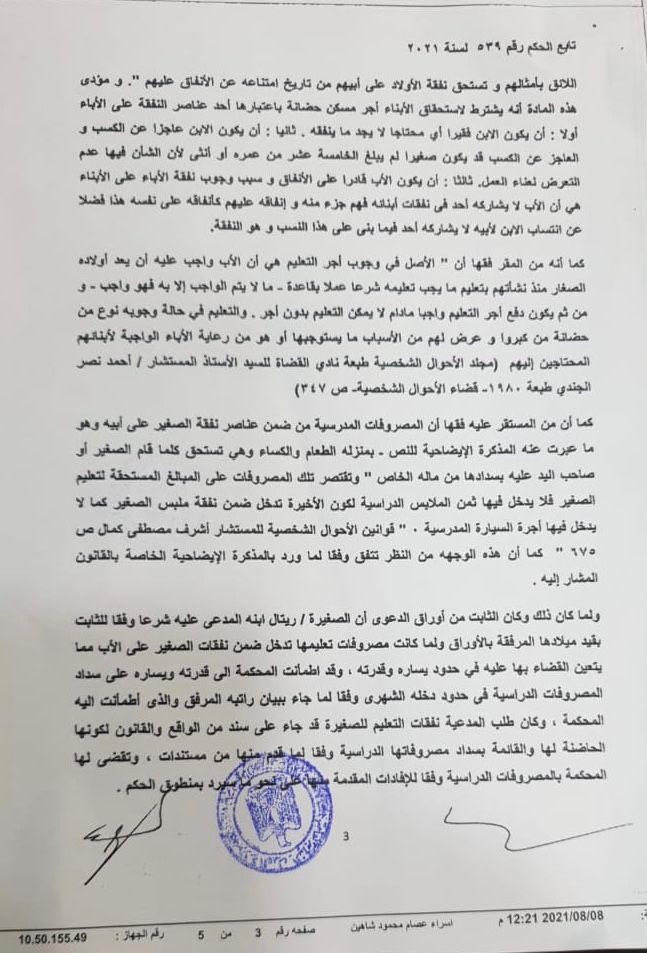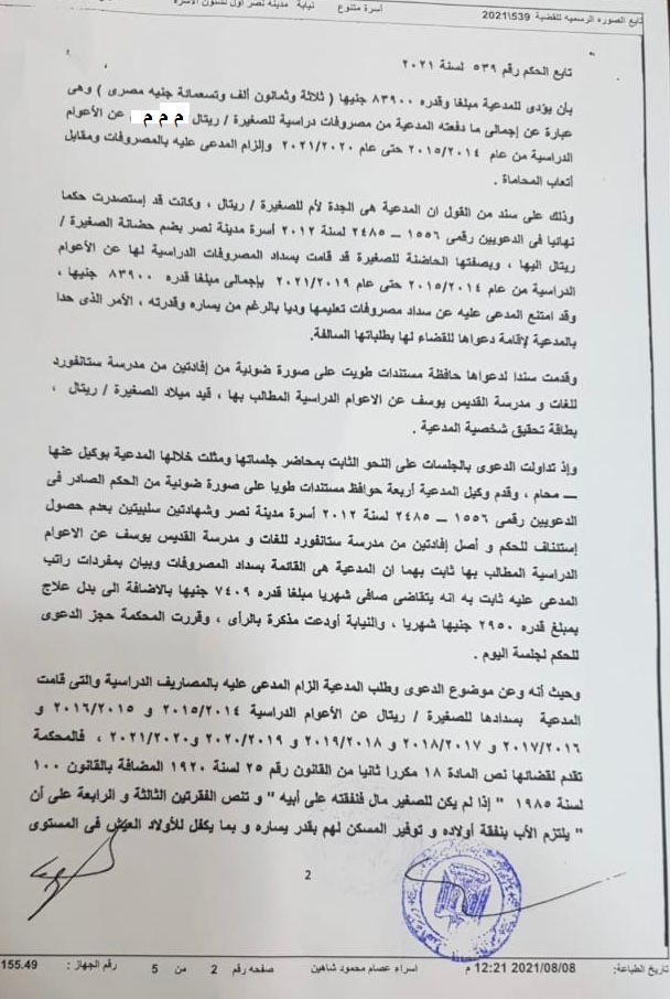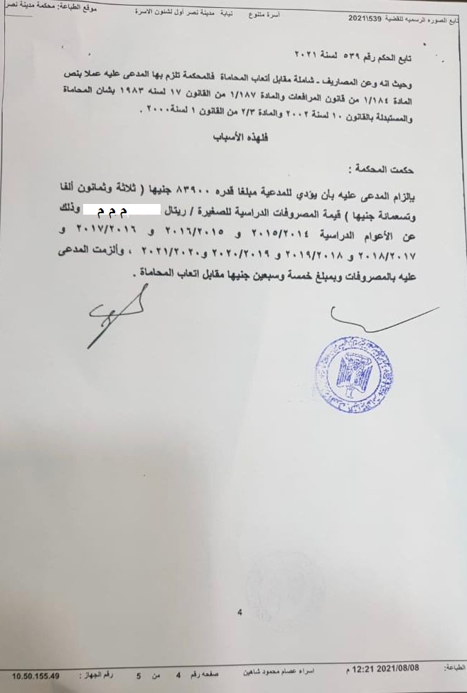 ولأن ثوب القضاء شامخ ناصع البياض لا يقبل المحاباة ولا يعرف المواربة فقد صدر حكم الدائرة الخامسة بمحكمة أسرة مدينة نصر ثان في الدعوى رقم 539 لسنة 2021 قضائية مرصعًا بالذهب متضمنًا بإلزام المدعى عليه بأن يؤدي للمدعية مبلغ قدره (ثلاثة وثمانون ألفًا وتسعمائة جنيه) قيمة المصروفات الدراسية للصغيرة ريتال م م، عن الأعوام الدراسية من 2014/2015 حتى 2020/2021 والزمت المدعى عليه بالمصروفات ومبلغ خمسة وسبعين جنيهًا مقابل أتعاب المحاماة.