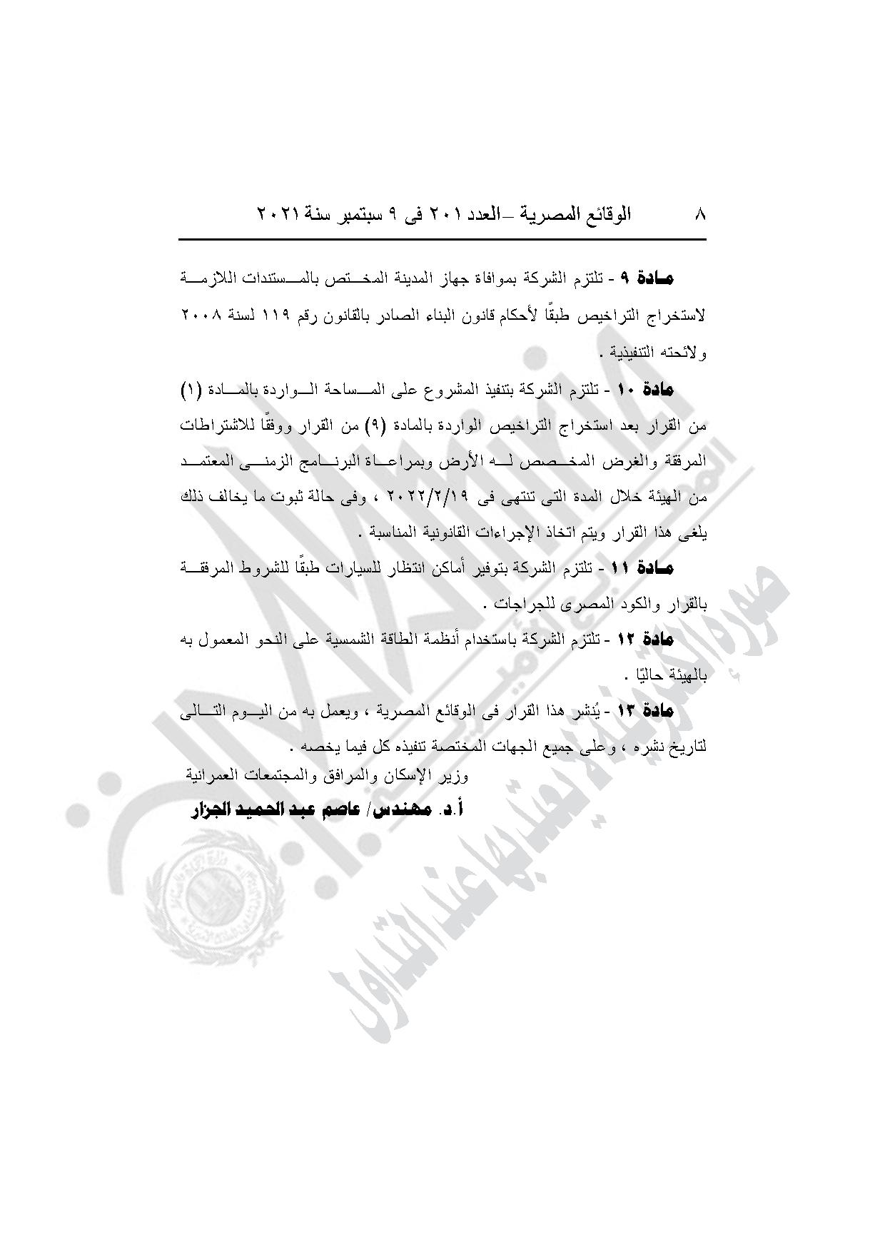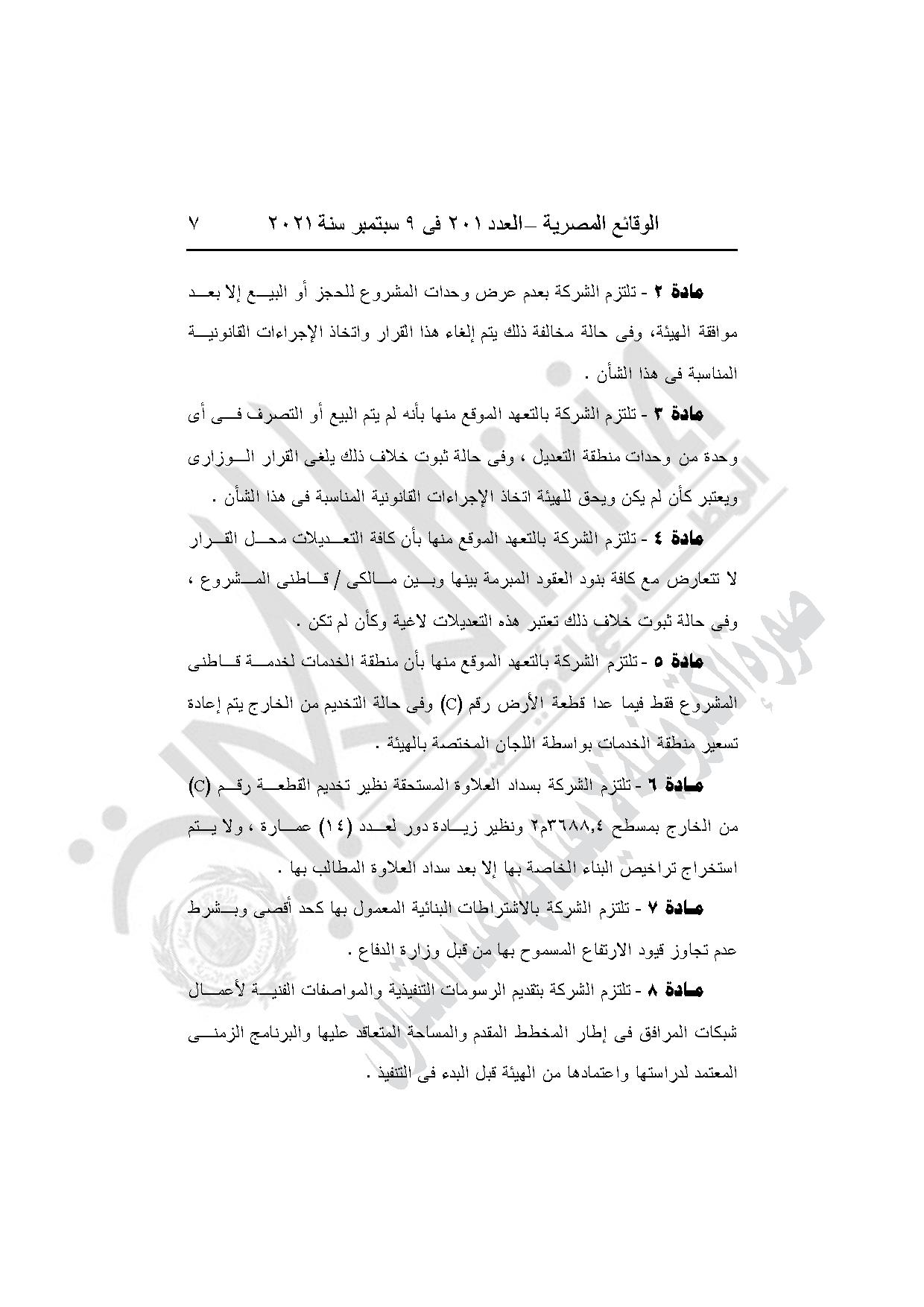 وجاء في المادة الثانية للقرار "تلتزم الشركة بعدم عرض وحدات المشروع للحجز أو البيع إلا بعد موافقة الهيئة، وفي حالة مخالفة ذلك يتم إلغاء القرار واتخاذ الإجراءات القانونية المناسبة في هذا الشأن.