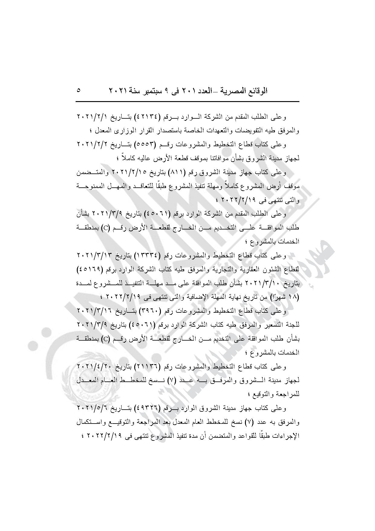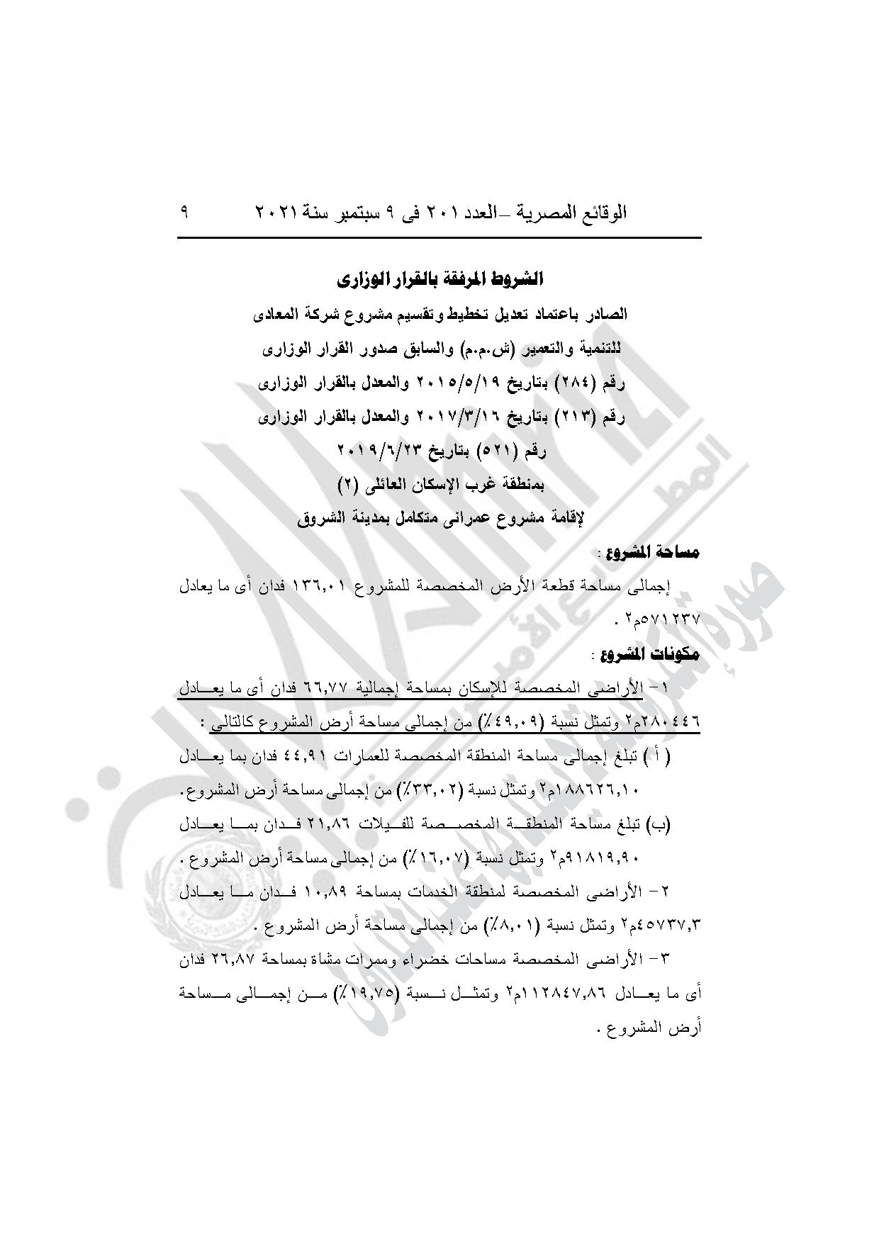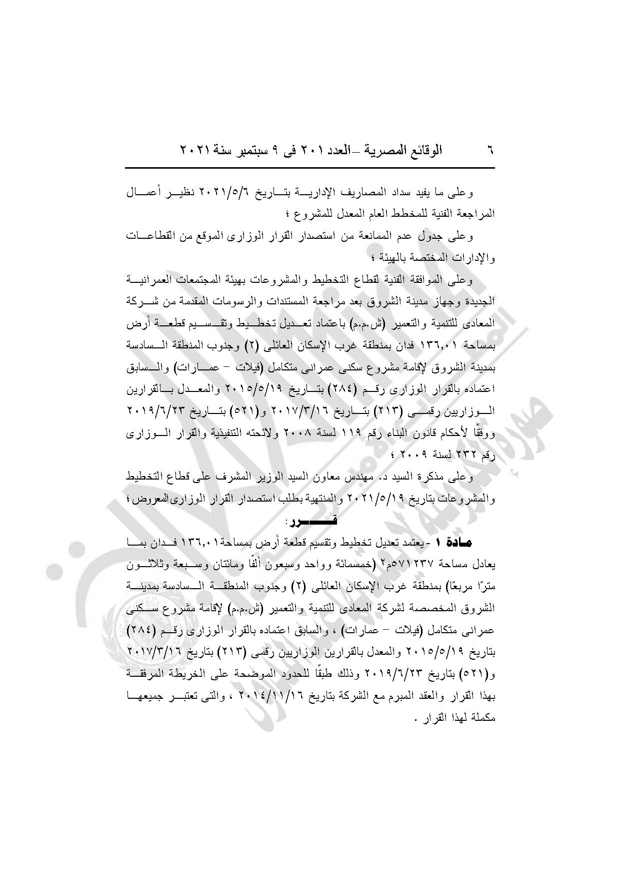 وينص القرار في مادته الأولى على اعتماد تعديل تخطيط وتقسيم قطعة أرض بمساحة 136.01 فدان، بما يعادل 571237 مترًا مربعًا، بمنطقة غرب الإسكان العائلي (2) وجنوب المنطقة السادسة بمدينة الشروق المخصصة لشركة المعادي للتنمية والتعمير (ش.م.م) لإقامة مشروع سكني عمراني متكامل (فيلات- عمارات)، والسابق اعتماده بالقرار الوزاري رقم (284) بتاريخ 19/5/2015، والمعدل بالقرارين الوزاريين رقمى (213) بتاريخ 16/3/2017، و(521) بناريخ 23/6/2019.