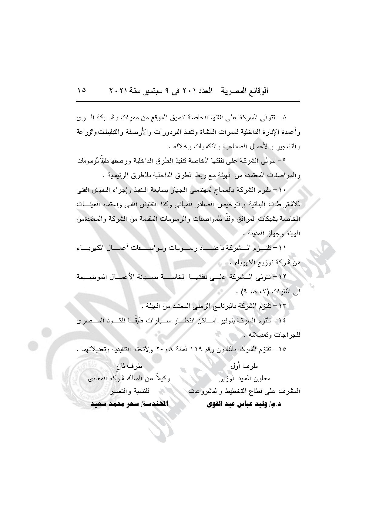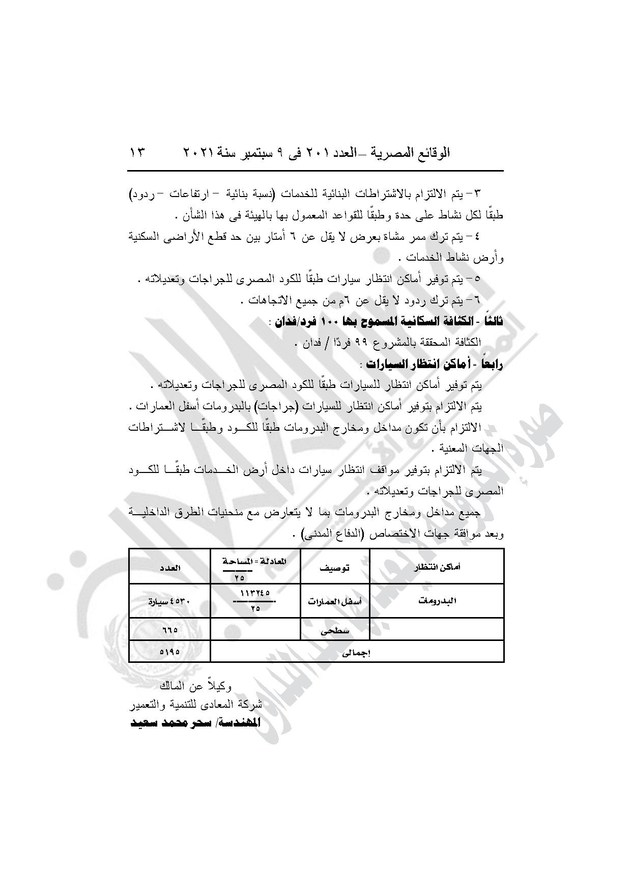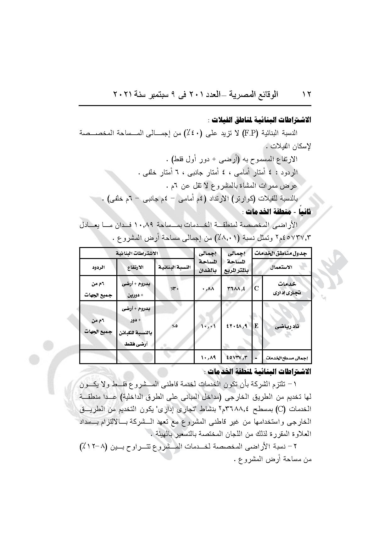 وينص القرار في مادته الأولى على اعتماد تعديل تخطيط وتقسيم قطعة أرض بمساحة 136.01 فدان، بما يعادل 571237 مترًا مربعًا، بمنطقة غرب الإسكان العائلي (2) وجنوب المنطقة السادسة بمدينة الشروق المخصصة لشركة المعادي للتنمية والتعمير (ش.م.م) لإقامة مشروع سكني عمراني متكامل (فيلات- عمارات)، والسابق اعتماده بالقرار الوزاري رقم (284) بتاريخ 19/5/2015، والمعدل بالقرارين الوزاريين رقمى (213) بتاريخ 16/3/2017، و(521) بناريخ 23/6/2019.