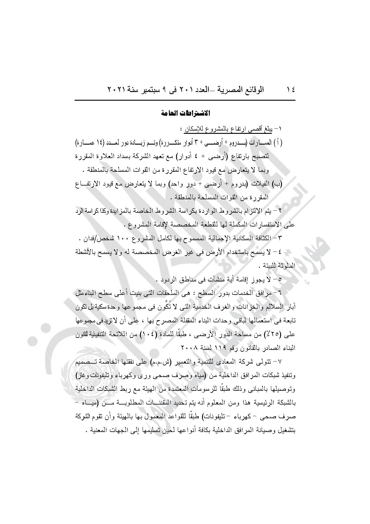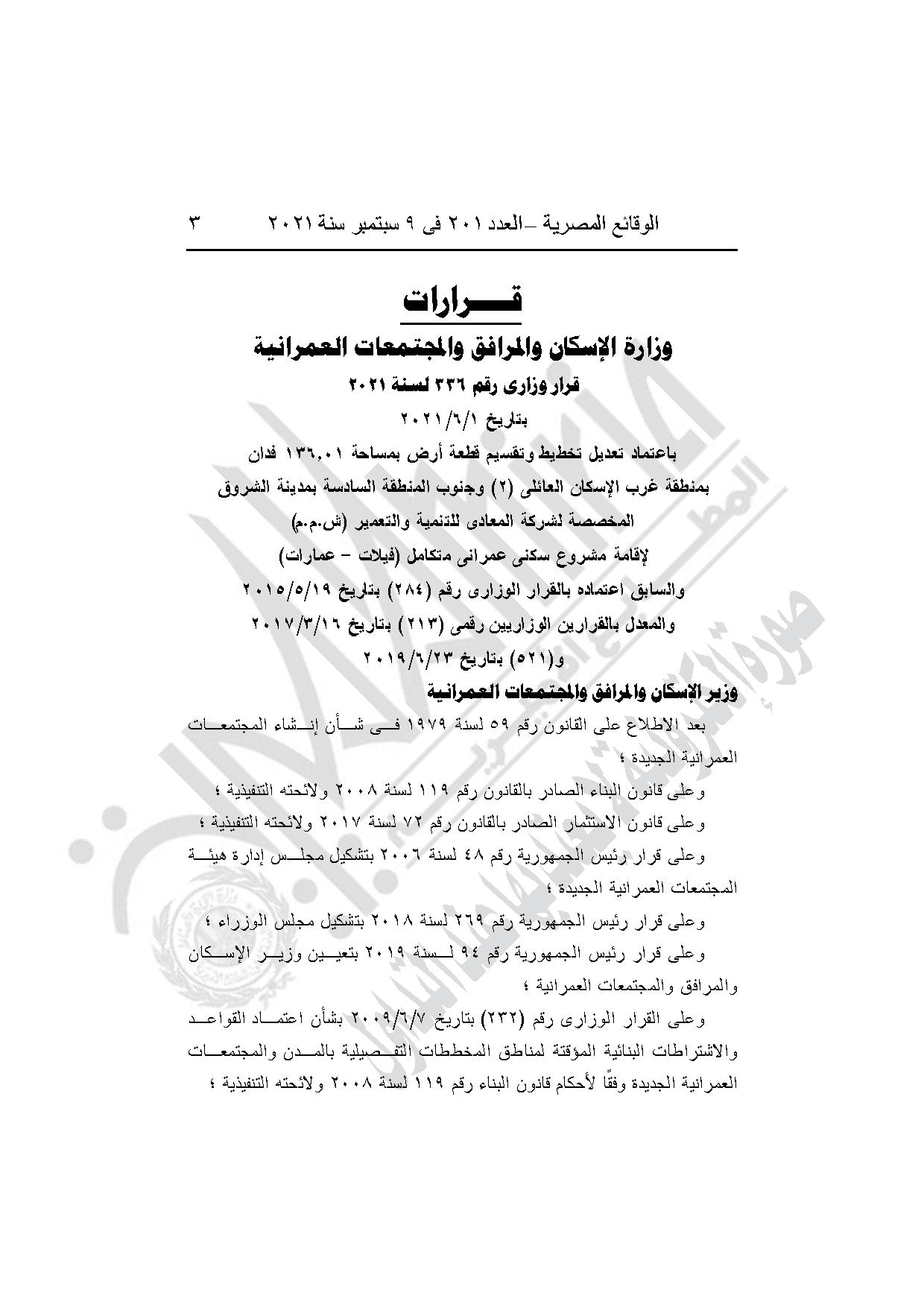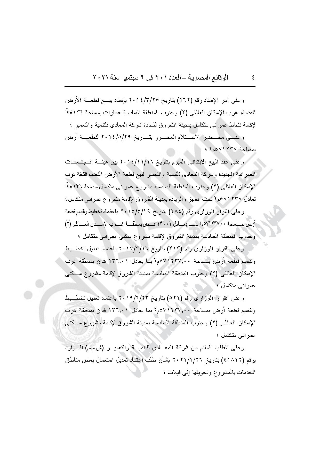 نشرت جريدة الوقائع المصرية في عددها رقم 201، الصادر في 9 سبتمبر 2021، قرار وزارة الإسكان والمرافق والمجتمعات العمرانية رقم 336 لسنة 2021، بشأن اعتماد تعديل تخطيط وتقسيم قطعة أرض بمساحة 136.01 فدان بمنطقة غرب الإسكان العائلي (2) وجنوب المنطقة السادسة بمدينة الشروق المخصصة لشركة المعادي للتنمية والتعمير (ش.م.م) لإقامة مشروع سكني عمراني متكامل (فيلات- عمارات).