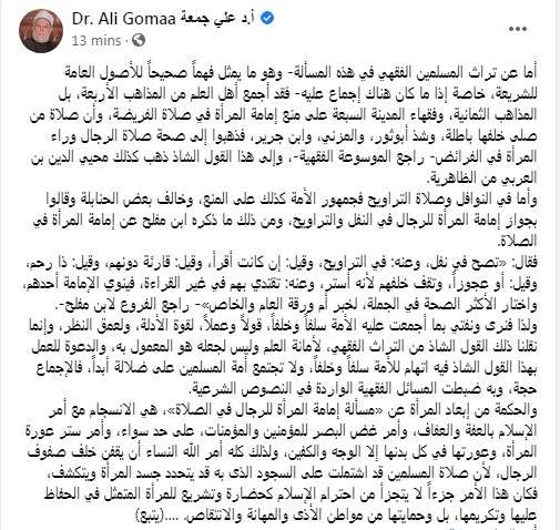 وكتب الدكتور علي جمعة تدوينة على الفيس بوك "أما عن تراث المسلمين الفقهي في هذه المسألة،إمامة المرأة للرجال في الصلاة، وهو ما يمثل فهمًا صحيحًا للأصول العامة للشريعة، خاصة إذا ما كان هناك إجماع عليه- فقد أجمع أهل العلم من المذاهب الأربعة، بل المذاهب الثمانية، وفقهاء المدينة السبعة على منع إمامة المرأة في صلاة الفريضة، وأن صلاة من صلى خلفها باطلة".