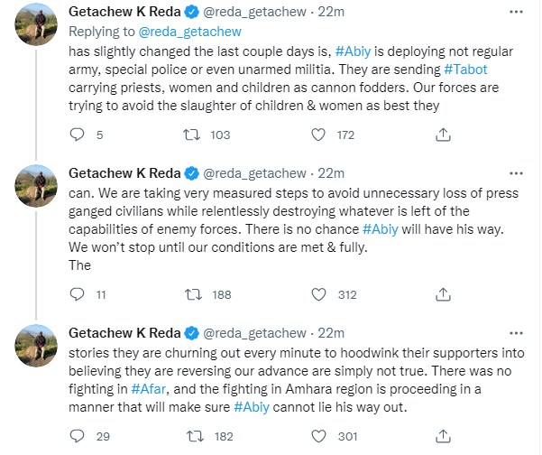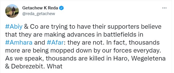 وكتب جيتشيوا رضا تغريدة عبر تويتر "يحاول أبي أحمد وشركاه إقناع مؤيديهم بأنهم يحرزون تقدمًا في ساحات القتال في أمهرة وعفر، لكنهم ليسوا كذلك في الواقع يتم تطهير آلاف منهم من قبل قواتنا كل يوم، قُتل الآلاف منهم في هذه المدن(Haro – Wegeletena-Debrezebit).