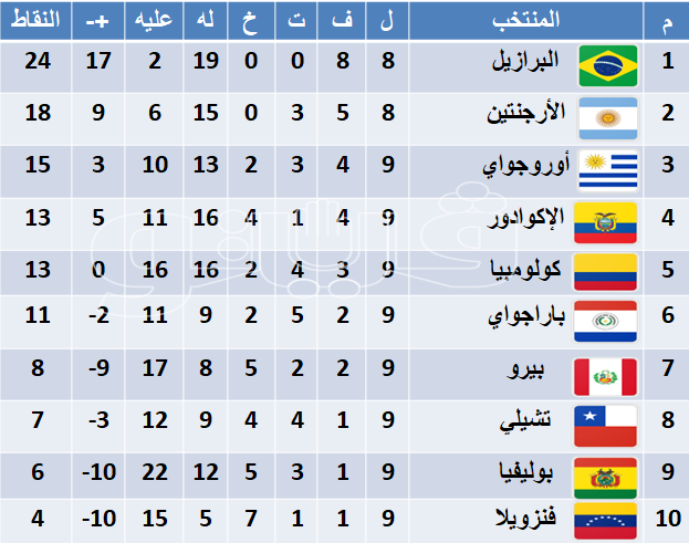 جدول ترتيب تصفيات أمريكا الجنوبية المؤهلة للمونديال بعد الجولة العاشرة