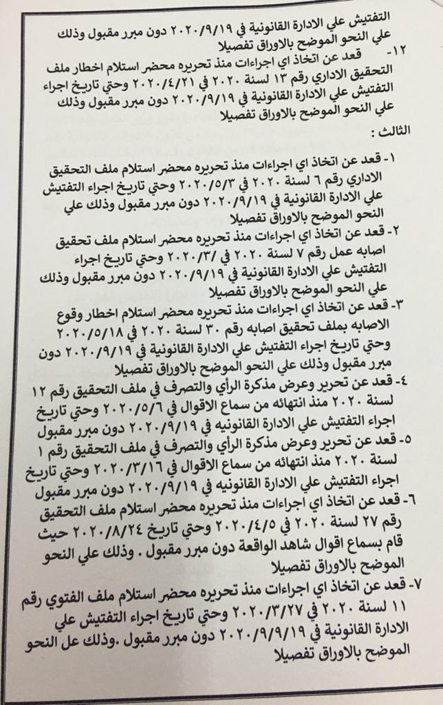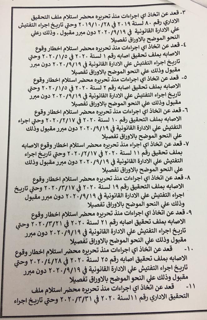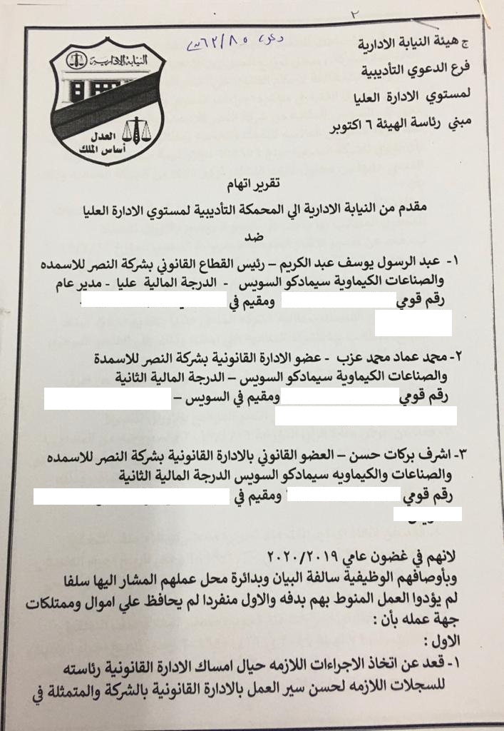 وتبين من تقرير الإتهام أن المحالين محمد عماد عزب وأشرف بركات حسن، العضوين القانونيين بالإدارة القانونية بالشركة لم يتخذا ثمة إجراءات بشأن عدد من ملفات التحقيق الإداري عن حدوث بعض الإصابات وحتى إجراء التفتيش على الإدارة القانونية دون مبرر مقبول، كما تقاعسا عن تحرير وعرض مذكرات الرأي والتصرف ببعض التحقيقات الإدارية.