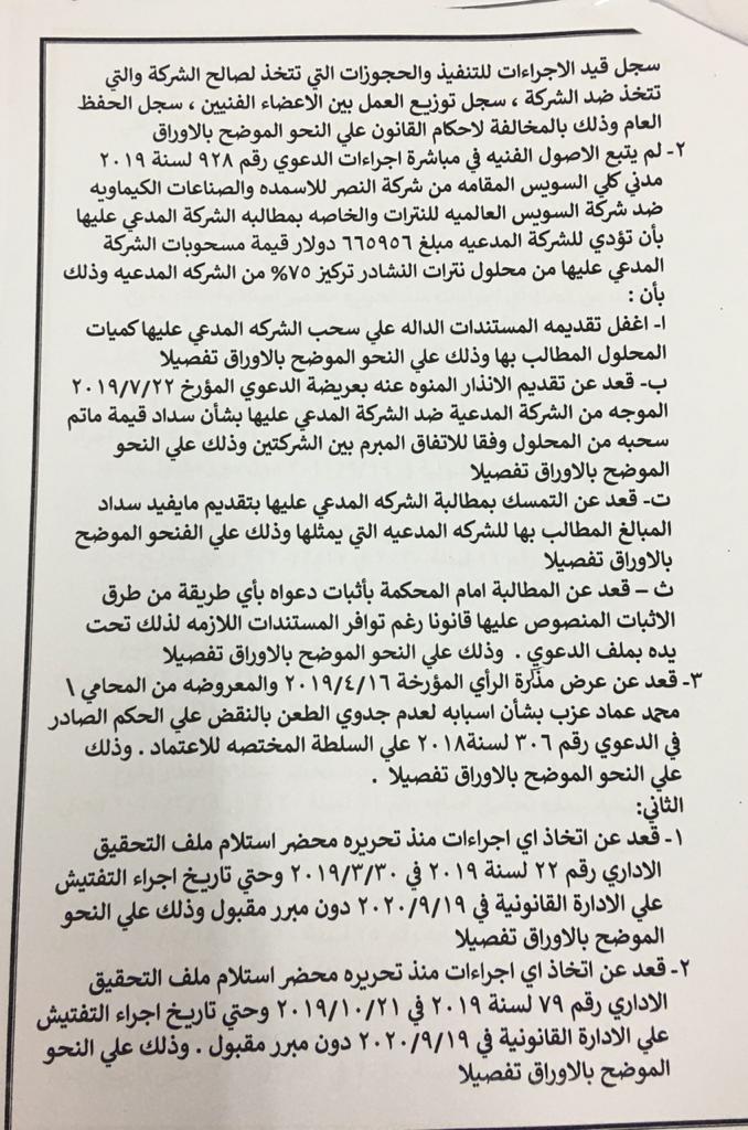 ولم يتبع الأصول الفنية في مباشرة إجراءات الدعوى رقم 928 لسنة 2019 مدني كلي السويس المقامة من الشركة جهة عمله ضد شركة السويس العالمية للنترات بشأن مطالبتها بدفع 666 الف دولار قيمة مسحوباتها من محلول نترات النشادر تركيز 75%، وأغفل تقديم المستندات الدالة على ذلك، ولم يتمسك بمطالبة الشركة بتقديم ما يفيد سدادها مديونياتها لجهة عمله، كما لم يطالب أمام المحكمة بإثبات دعواه رغم وجود المستندات بملف الدعوى