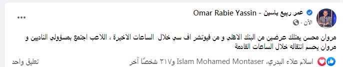أكد الإعلامي عمر ربيع ياسين عبر صفحته الرسمية بموقع التواصل الاجتماعي فيسبوك، أن مروان محسن يمتلك عرضين من البنك الأهلي ومن فيوتشر اف سي، خلال الساعات الأخيرة اللاعب اجتمع بمسؤولي الناديين، ومروان يحسم انتقاله خلال الساعات القادمة.