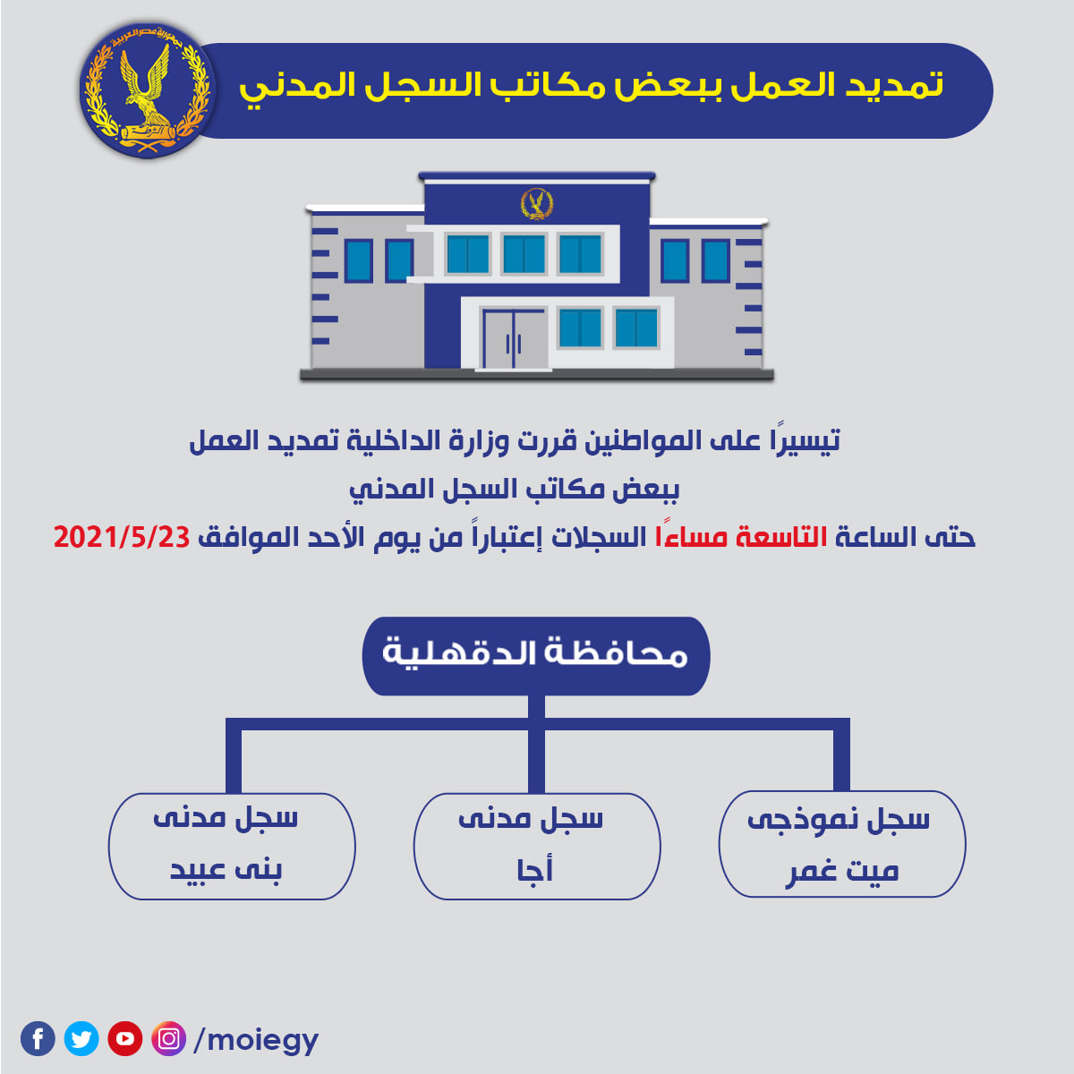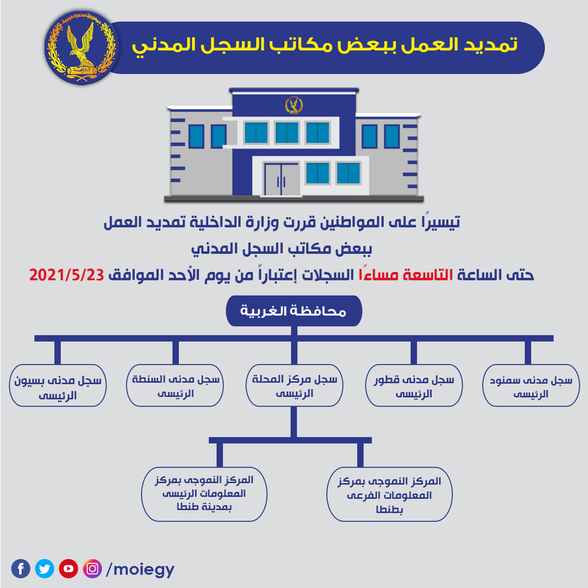 كما شملت سجل مدني بنها النموذجي بمحافظة القليوبية، سجل مدني الشيخ زايد أول بمحافظة الجيزة، والمركز النموذجي بديوان عام القطاع بمحافظة القاهرة يوم الجمعة من الساعة 1 ظهرًا حتى 9 مساءً.