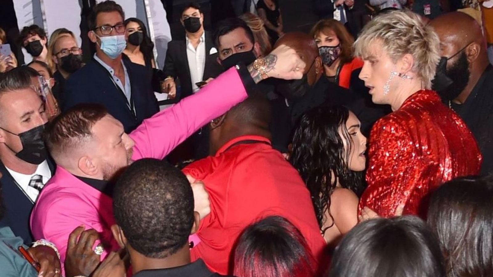 وفقا لموقع TMZ Sports، فقد بدأ كل شيء عندما اقترب ماكجريجور، من النجمة الأمريكية ميجان فوكس، ليرحب بها، والتي تواعد ماشين كيلي، ليقوم الأخير بإبعاد نجم UFC بعيدا، ليغضب بشدة الأخير ويحاول الاشتباك معه.