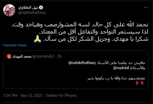 وكتب نبيل الحلفاوي، في تغريدته، ردًا على تغريدات المتابعين: «تسلموا جميعا يا رب»، وبتتبع باقي الردود على التغريدة، تبين أن سبب غياب «الحلفاوي» خلال الفترة الماضية، هو مرور زوجته بوعكة صحية، إذ كتب إحدى المتابعين له: «ألف حمدا لله ع السلامة يا قبطان.. نورت تويتر. ربنا يطمن حضرتك ع استاذة نادية»، ليرد عليها الفنان القدير قائلًا: «يا رب يا سحر»، ليؤكد أن زوجته «السيدة نادية» قد مرت بوعكة صحية في الأيام الماضية، لكنه لم يكشف عن تفاصيلها.