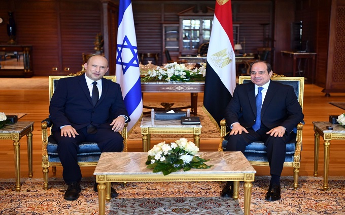 استقبل الرئيس عبد الفتاح السيسي اليوم بمدينة شرم الشيخ رئيس الوزراء الإسرائيلي "نفتالى بينيت" وذلك بحضور سامح شكري وزير الخارجية وعباس كامل رئيس المخابرات العامة، والدكتور آيال هولاتا رئيس مجاس الامن القومي الاسرائيلي والفريق اول آلي جيل السكرتير العسكري لرئيس الوزراء والسيدة شيمريت مائير كبيرة المستشاريين والسفيرة الاسرائلية بالقاهرة.