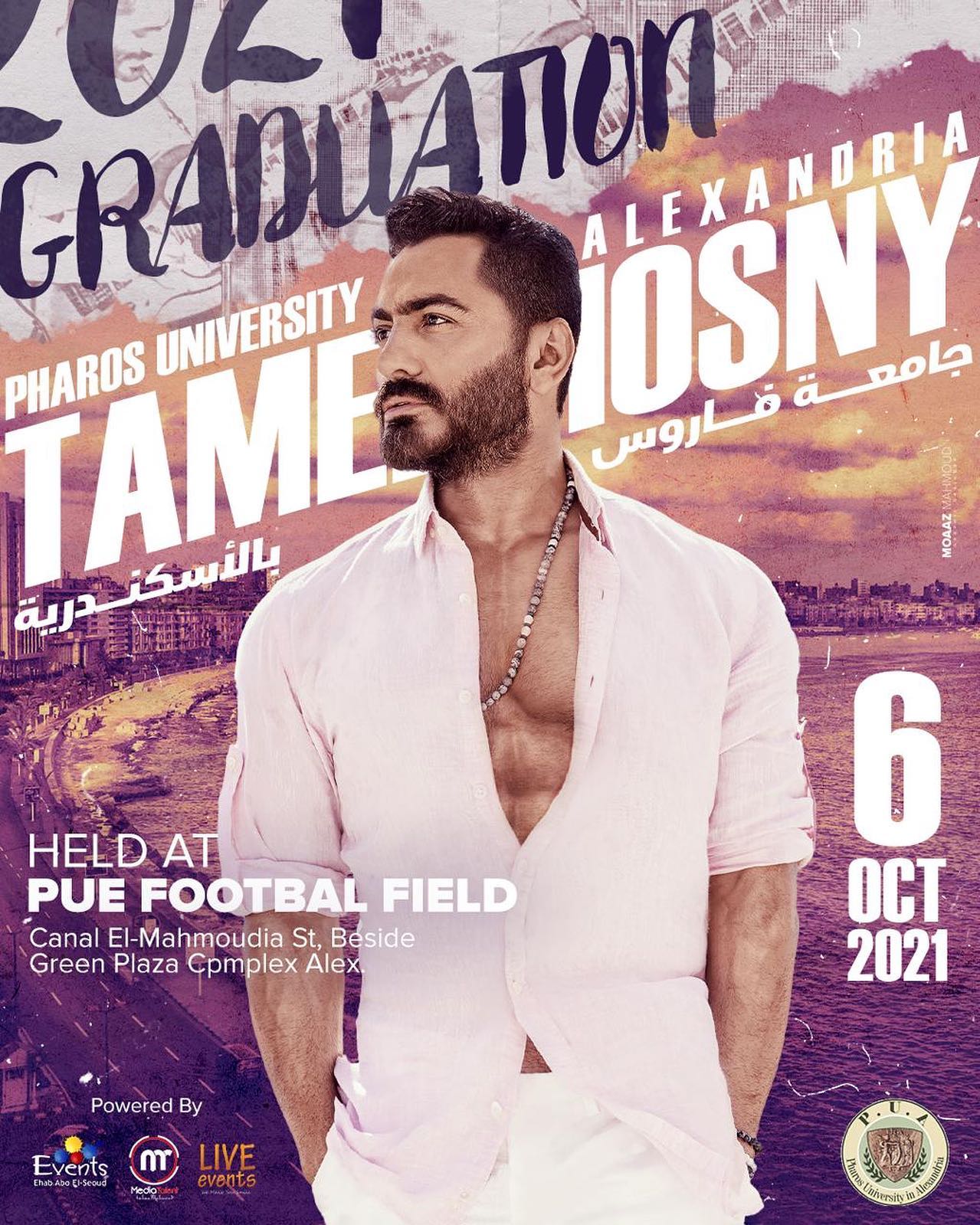 يستعد الفنان تامر حسني لإحياء حفل غنائي يوم الأربعاء الموافق 6 أكتوبر المقبل، في جامعة "الفردوس" بمدينة الإسكندرية.