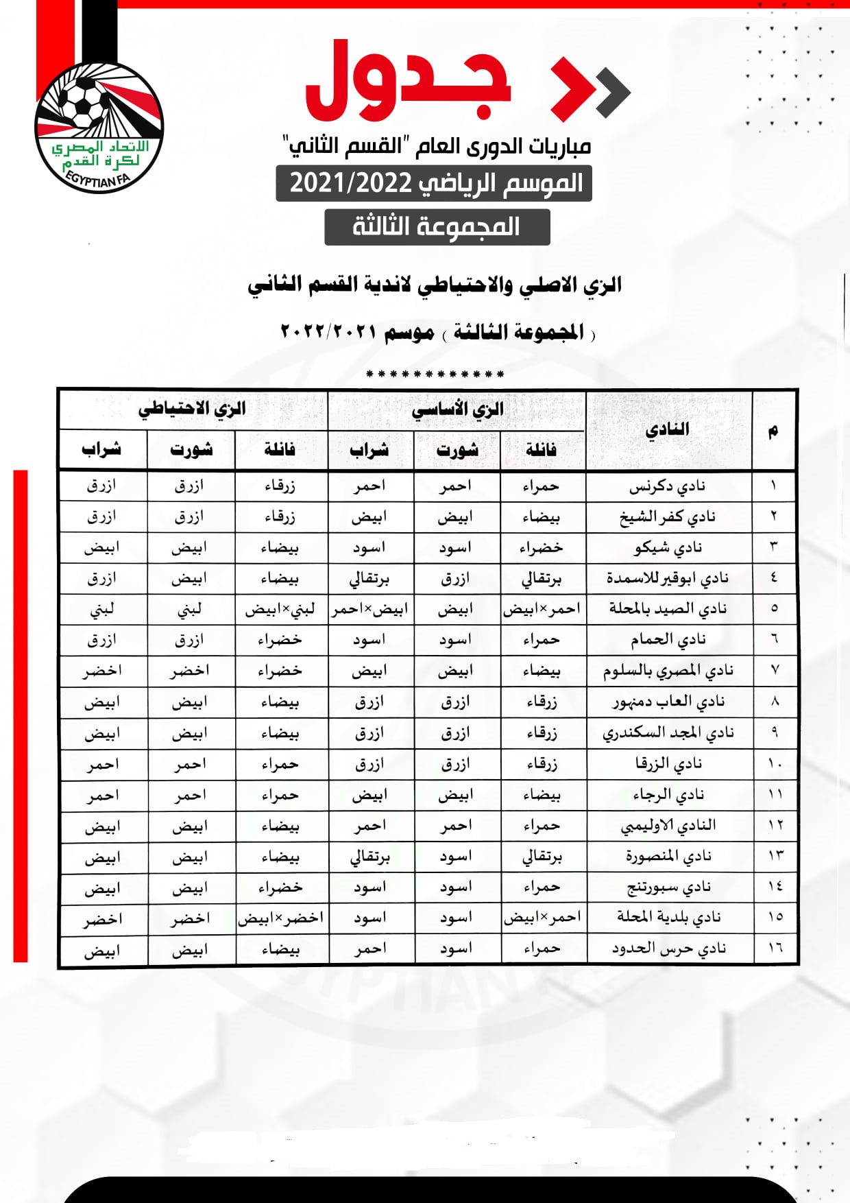 أعلنت إدارة المسابقات بالاتحاد المصري لكرة القدم جدول مباريات القسم الثاني لمسابقة الدوري العام للموسم الجديد 21-2022 للمجموعة الثالثة مجموعة بحري والإسكندرية".