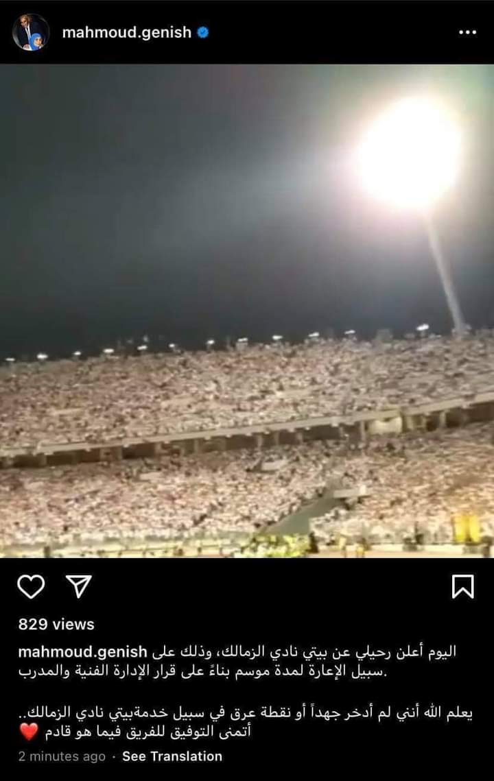 وأكد جنش عبر حسابه أن رحيله جاء نتيجة رغبة الإدارة الفنية وكارتيرون المدير الفني للفريق.