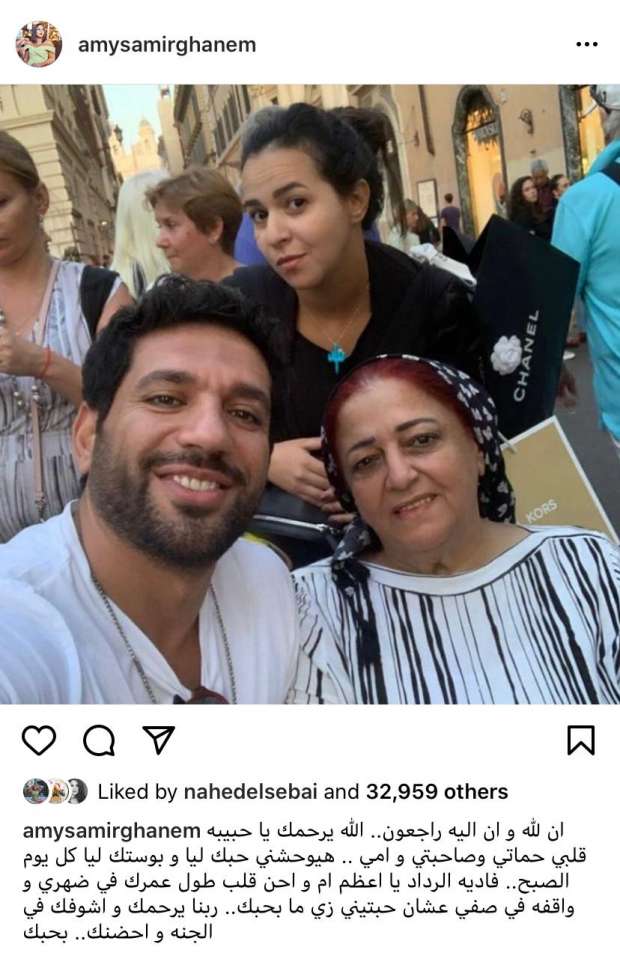 ونشرت إيمي صورة حينها تجمعها بزوجها ووالدته الراحلة،عبر حسابها على «إنستجرام» وعلقت: «إنا لله وإنا إليه راجعون.. الله يرحمك يا حبيبه قلبي حماتي وصاحبتي وامي.. هيوحشني حبك ليا وبوستك ليا كل يوم الصبح.. فاديه الرداد يا اعظم ام واحن قلب طول عمرك في ضهري وواقفه في صفي عشان حبتيني زي ما بحبك.. ربنا يرحمك وأشوفك في الجنه وأحضنك.. بحبك».