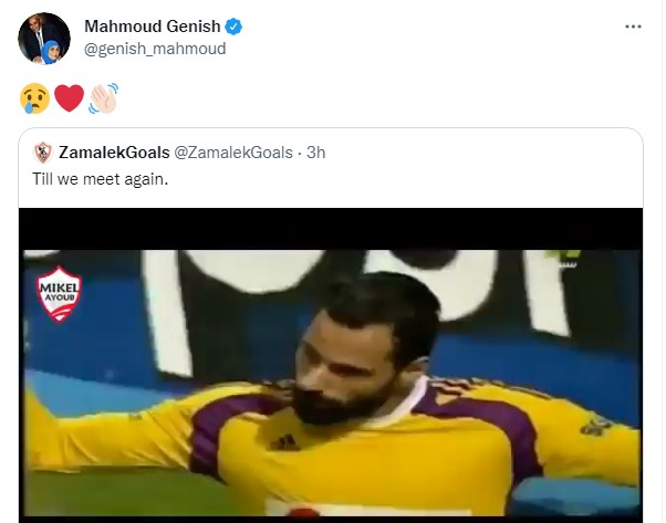 علق محمود عبد الرحيم "جنش"، حارس مرمى نادي الزمالك، على رسالة الوداع التي بثها الزمالك لجنش، قائلًا فيها: "حتى نلتقي مرة أخرى"، لينشر جنش "إيموشن" لوجه يبكي وقلب أحمر مع رمز اليد المودعة، ردًا على رسالة نادي الزمالك، ومعبرًا عن حزنه للرحيل من ناديه الزمالك.