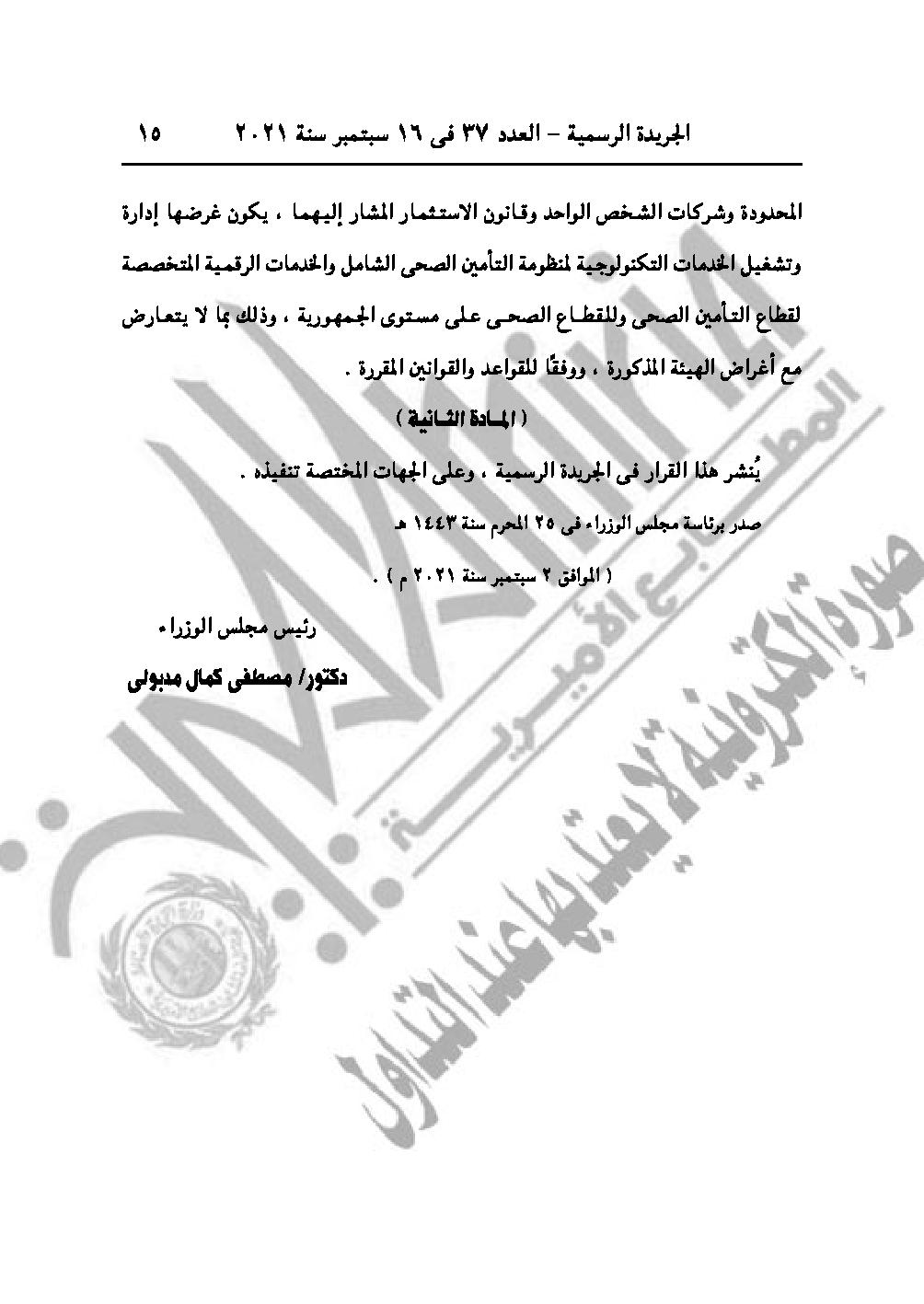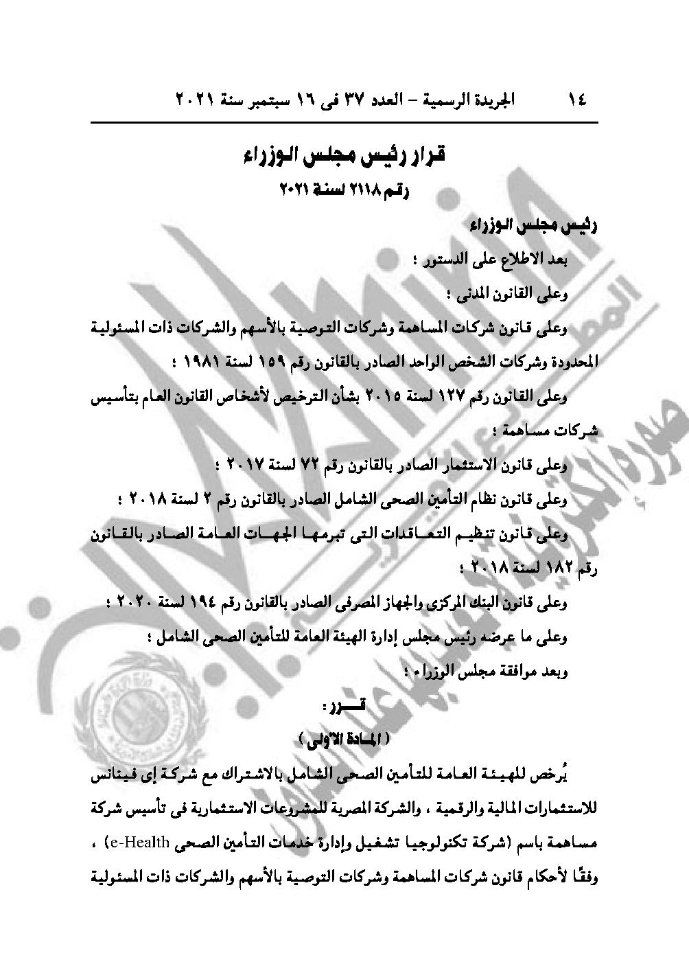 نشرت الجريدة الرسمية في عددها رقم 37، الصادر في 16 سبتمبر 2021، قرار رئيس مجلس الوزراء الدكتور مصطفى مدبولي رقم 2118 لسنة 2021، بشأن الترخيص للهيئة العامة للتأمين الصحي الشامل بالاشتراك مع شركة إى فينانس للاستثمارات المالية والرقمية، والشركة المصرية للمشروعات الاستثمارية في تأسيس شركة (e-Health).