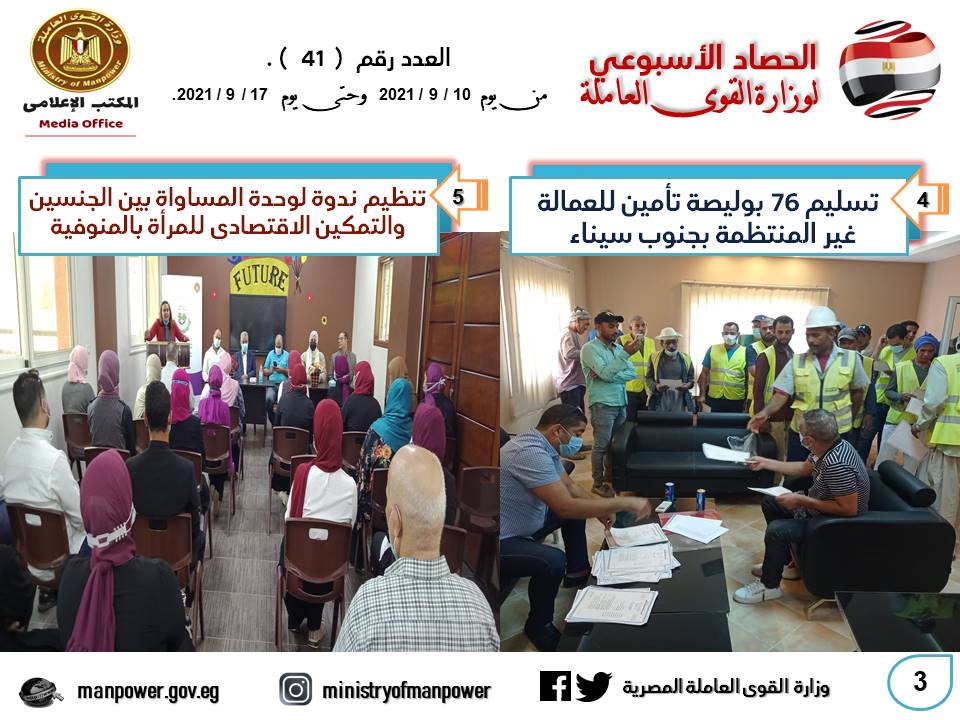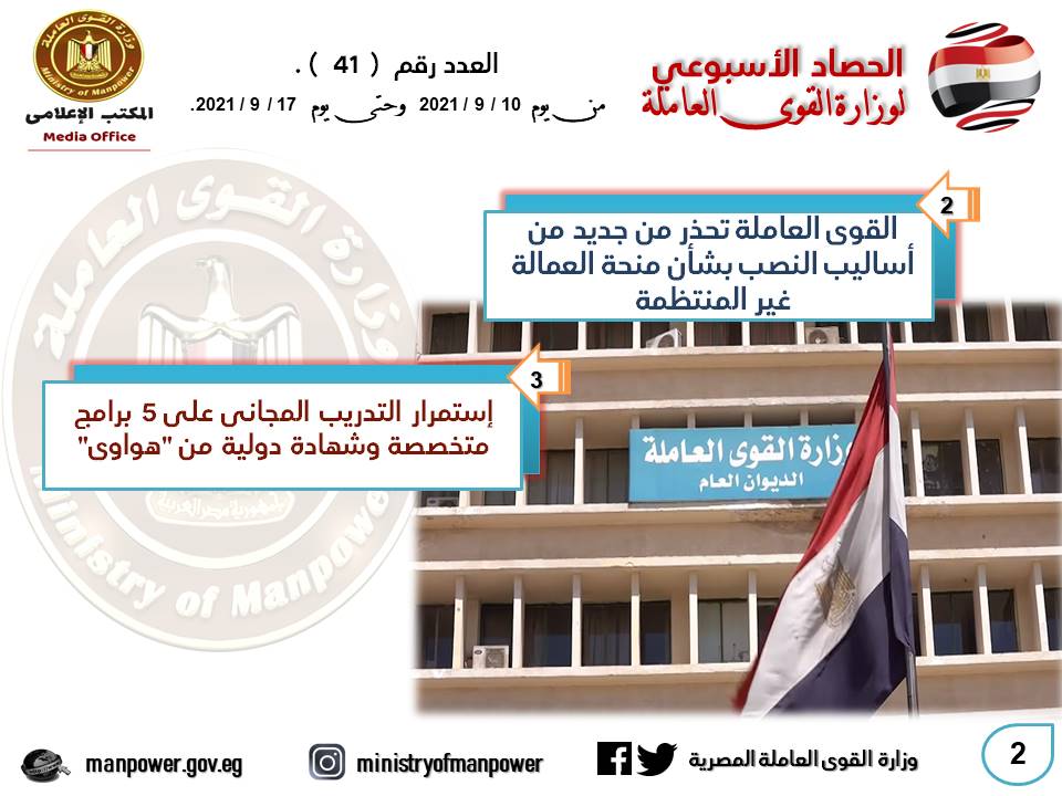 شهد حصاد الأسبوع الحالي، في وزارة القوى العاملة العديد من الأحداث المهمة خلال الفترة - من 10 إلى 16 سبتمبر الجاري- منها تحذير وزارة القوى العاملة من جديد من بعض اساليب النصب باسم الوزارة بمواقع التواصل الإجتماعي بخصوص منحة العمالة غير المنتظمة، واستمرار التدريب المجاني أونلاين بالتعاون مع شركة "هواوي للتكنولوجيا مصر" على 5 برامج متخصصة للخريجين، ومتابعة وزير القوى العاملة سير مبادرة " مهارتك أساس مهنتك " لتأهيل الشباب والتدريب الفندقي بسوهاج، وتسليم 76 وثيقة للتأمين على الحياة بجنوب سيناء، وتنظيم ندوة بعنوان: "المساواة بين الرجل والمراة والتمكين الاقتصادي وتعزيز مبدأ تكافؤ الفرص والقضاء على جميع أشكال التمييز والعنف ضد المرأة" بالمنوفية، وتعيين 4 آلاف و458 شابا في 7 محافظات، وتحصيل 10.6 مليون جنيه مستحقات العمالة المغادرة للأردن، و1.7 مليون جنيه مستحقات العمالة بالسعودية .