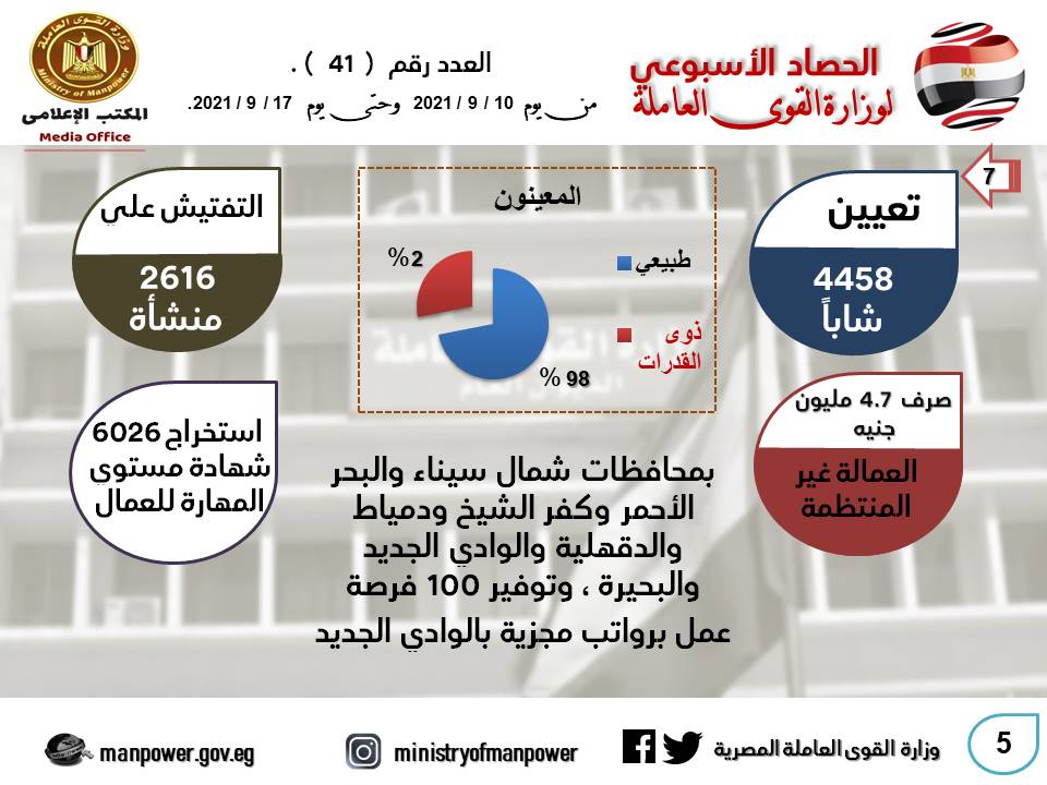 وشمل حصاد الأسبوع تعيين 4 آلاف و458 شابا في 7 محافظات، وصرف منح للرعاية الاجتماعية والصحية للعمالة غير المنتظمة المسجلة بمديريات القوى العاملة بمحافظات شمال سيناء، وكفر الشيخ، والبحر الأحمر، ودمياط، والدقهلية، والوادي الجديد، والبحيرة، بلغت 4 ملايين، و797 ألفًا و712 جنيه، والتفتيش على 2616 منشأة لتطبيق أحكام القانون، فضلًا عن إستخراج 6026 شهادة قياس مستوى المهارة، ورخصة مزاولة الحرفة لـ 6026 عاملا.