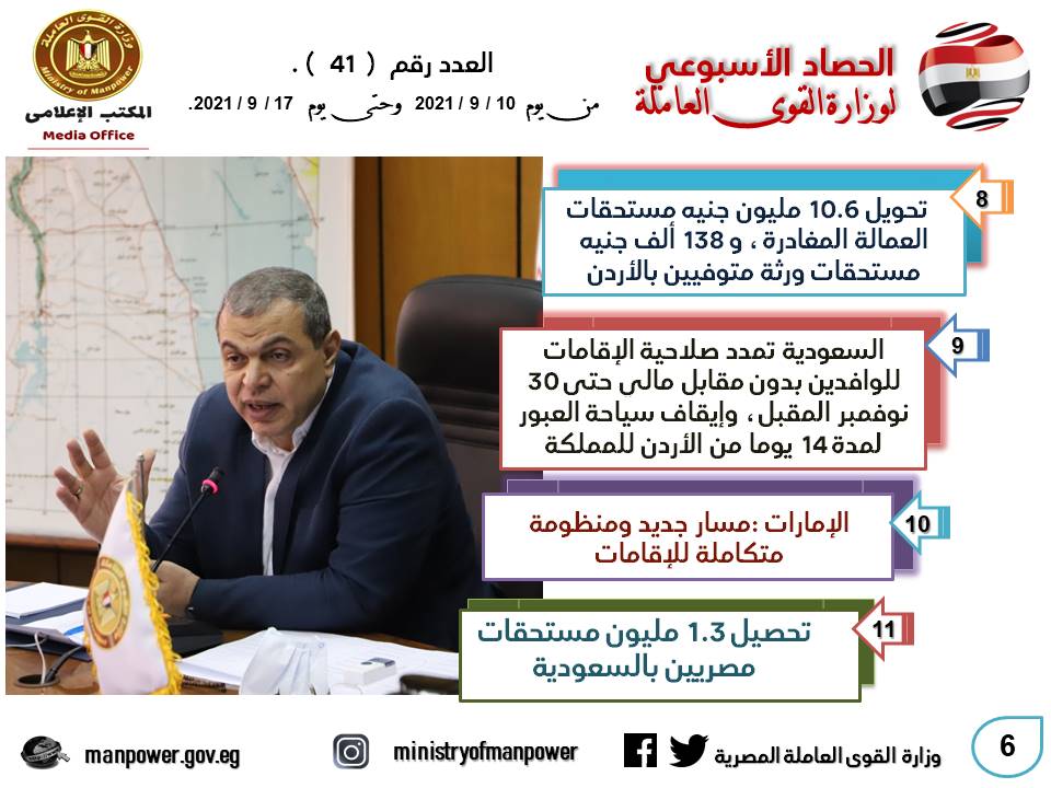 وعلى جانب آخر، أعلن وزير القوى العاملة، أن مكتب التمثيل العمالي التابع للوزارة بالسفارة المصرية بعمان-الأردن، استطاع بالمتابعة اللحظية والجهود المبذولة والمقابلات مع المسئولين بمؤسسة الضمان الاجتماعي بالأردن، واستكمالا لما تم تحويله سابقا، تم تحويل القائمة الـ 48 و49 من مستحقات الضمان الاجتماعي لنحو 609 عامل مصري لدى المؤسسة غادروا عمان نهائيا.