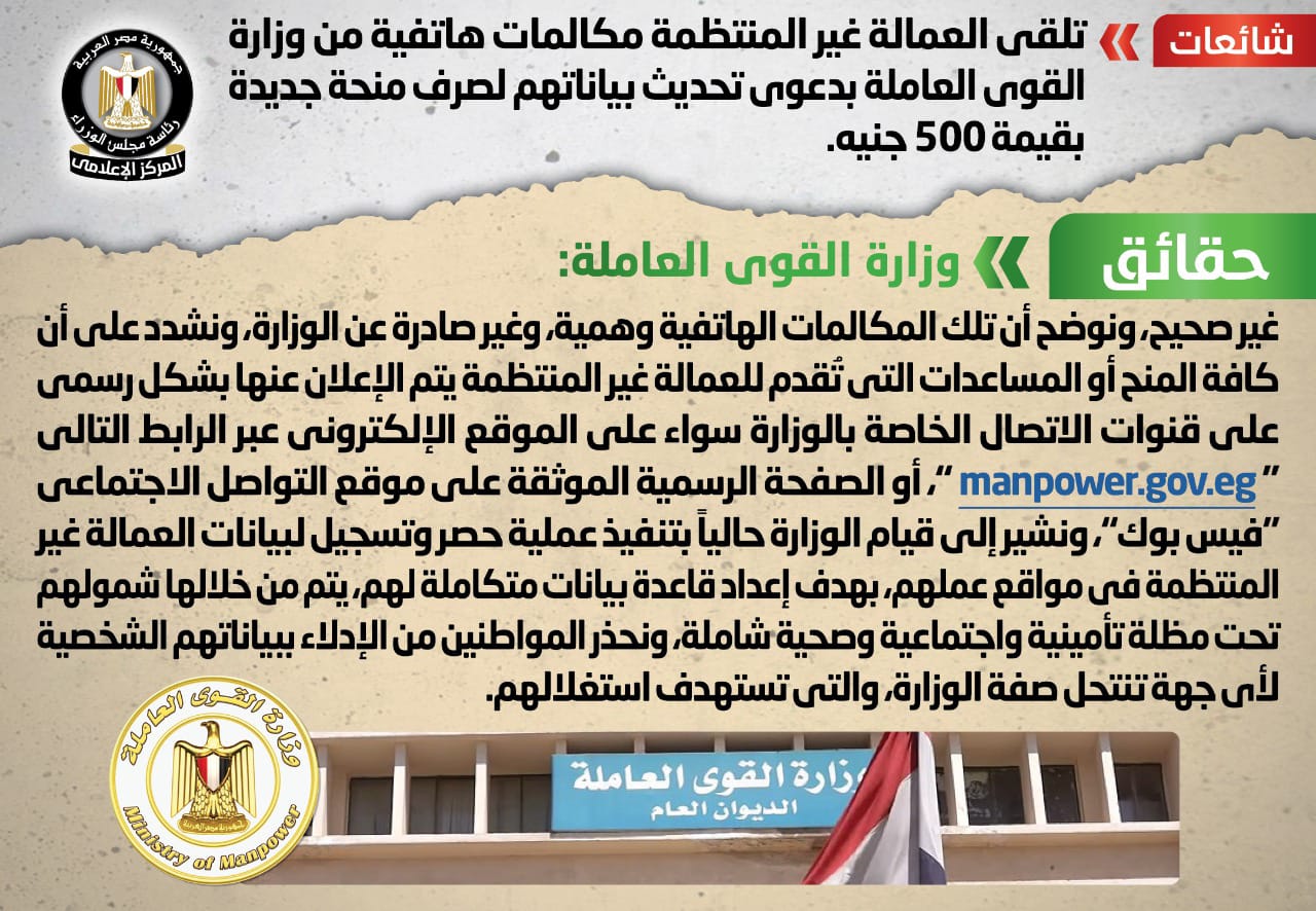 وأكدت وزارة القوى العاملة أنه لا صحة لقيام الوزارة بالاتصال الهاتفي بأي من العمالة غير المنتظمة لتحديث بياناتهم لصرف منحة جديدة بقيمة 500 جنيه، موضحةً أن تلك المكالمات الهاتفية وهمية، وغير صادرة عن الوزارة.