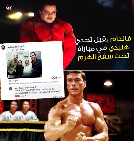 أعلن الفنان محمد هنيدي، استمراره في تحدي الممثل الأمريكي فاندام في مباراة تحت سفح الهرم على الصفحة الرسمية على الفيسبوك.