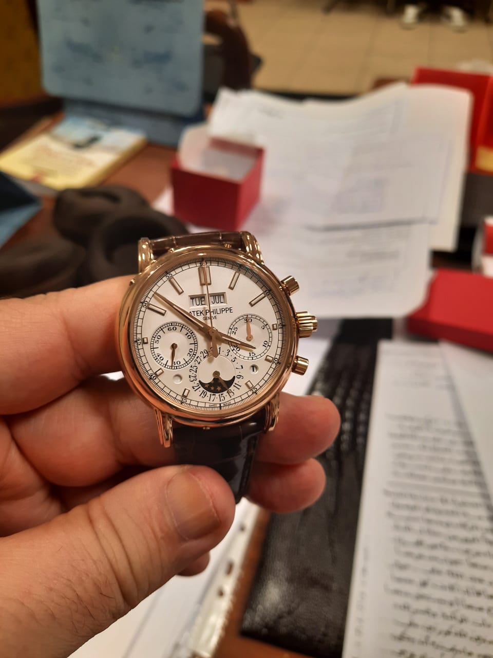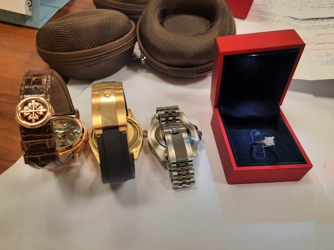 وبتفتيش حقائبه على جهاز الفحص بالأشعة بواسطة خالد محمد عبد الرحمن مأمور الجمرك والذي تلاحظ له وجود ساعات وسط طيات الملابس، قام مصطفى محمود المشنب مدير الحركة المشرف على صالة الوصول بمبنى الركاب رقم 2 بتكليف محمد دهشان عبد الحميد مأمور الجمرك بتفتيش حقائب الراكب يدويًّا مما أسفر عن وجود خاتم من الألماس وساعتين ماركة رولكس وساعة ماركة باتيك فيليب والأخيرة ثمنها مليون و128 ألف درهم إماراتي من واقع الفواتير التي وُجدت مع الراكب الذي اتضح أنه يعمل مندوبًا لإحدى شركات الساعات.