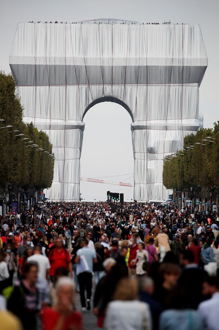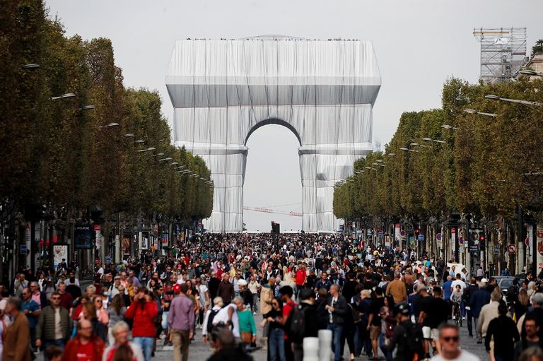 وصار بإمكان المشاة الذين يتجولون في أشهر شارع في باريس أن ينظروا إلى قوس النصر في مظهره الجديد المؤقت الذي اكتسبه من عمل فني من تصميم الفنان الراحل كريستو.