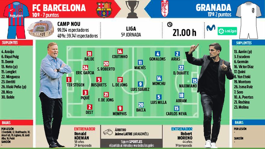 ووفقا لصحيفة "سبورت" الإسبانية، فإن برشلونة سيخوض مباراة الليلة، ضد غرناطة، بالتشكيلة التالية: