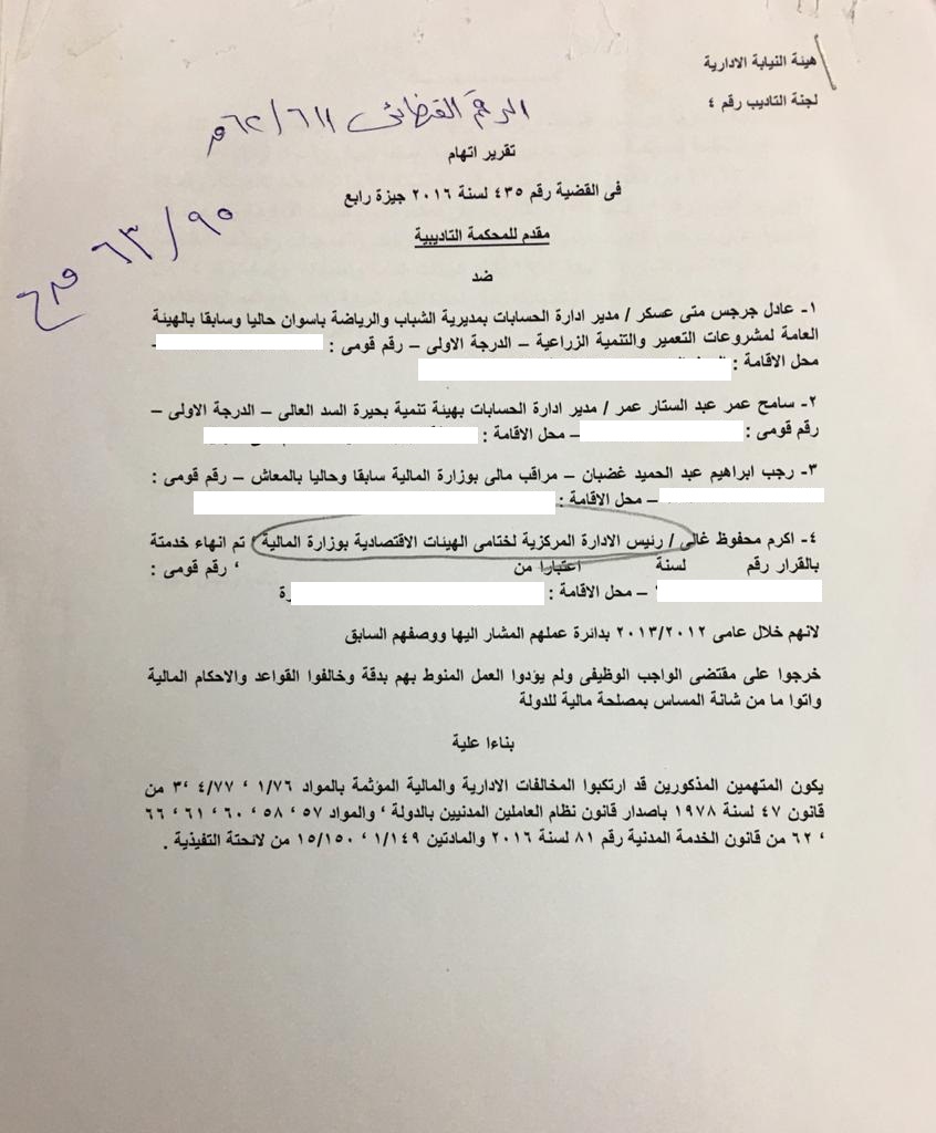 ضم تقرير الاتهام كلًا من عادل جرجس متى، مدير إدارة الحسابات بمديرية الشباب والرياضة بأسوان وسامح عمر عبد الستار، مدير إدارة الحسابات بهيئة تنمية بحيرة السد العالي ورجب إبراهيم عبد الحميد، مراقب مالي بوزارة المالية وأكرم محفوظ غالي، رئيس الإدارة المركزية لختامي الهيئات الاقتصادية بوزارة المالية.