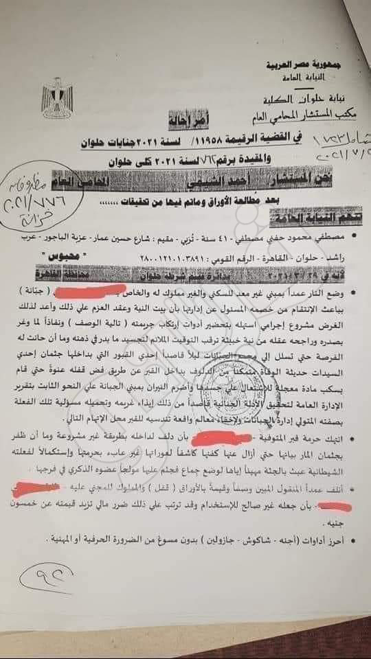 حصلت “فيتو” على أمر إحالة التربي الذي نبش قبر ممرضة في حلوان وأشعل النار بجثتها بعد انتهاك حرمتها.