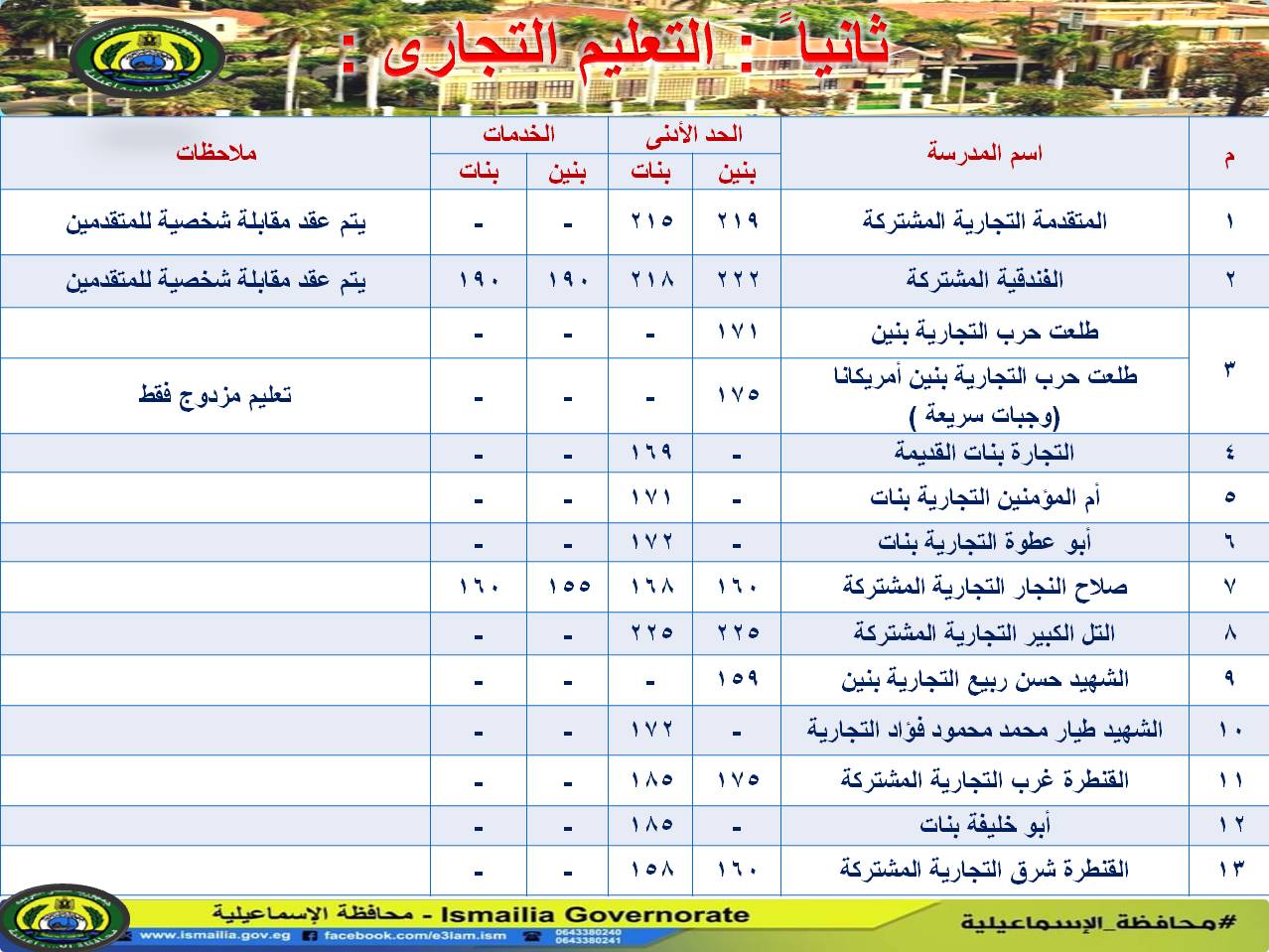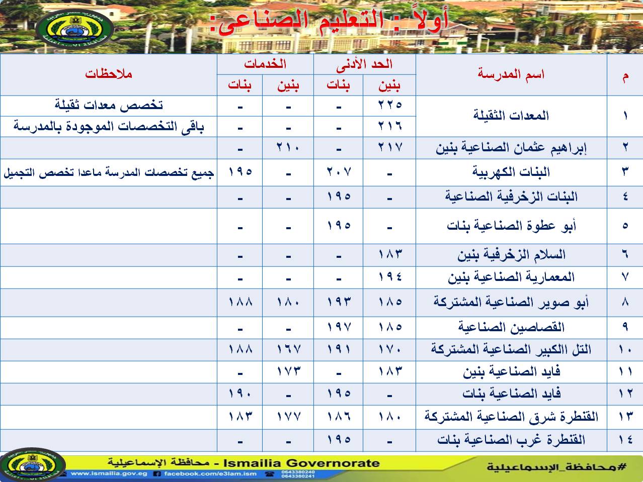 اعتمد اللواء شريف فهمى بشارة محافظ الإسماعيلية، تنسيق المرحلة الثانية للقبول بالصف الأول الثانوى بالمدارس الثانوية الفنية، وكذلك بفصول الخدمات بالتعليم الصناعى والتجارى والزراعي.