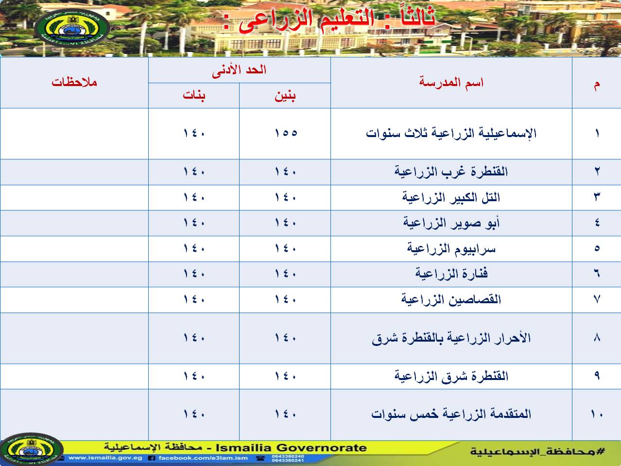 و صرح طه عجلان وكيل وزارة التربية والتعليم، إنه طبقا للجدول المرفق تم اعتماد درجات القبول بالمرحلة الثانية لتنسيق المدارس الفنية التجارية والزراعية بكافة مدارس المحافظة وذلك بعد دراسة الإحصاء التكراري للناجحين بالدور الثاني لتكون الحد الأدني للقبول بالمدارس الثانوية الفنية وبفصول الخدمات.