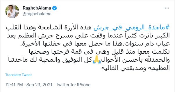 علق النجم اللبناني راغب علامة عبر حسابه الشخصي على موقع التغريدات الشهير "تويتر" على واقعة إغماء النجمة اللبنانية ماجدة الرومي على مسرح مهرجان جرش للثقافة والفنون بالأردن.