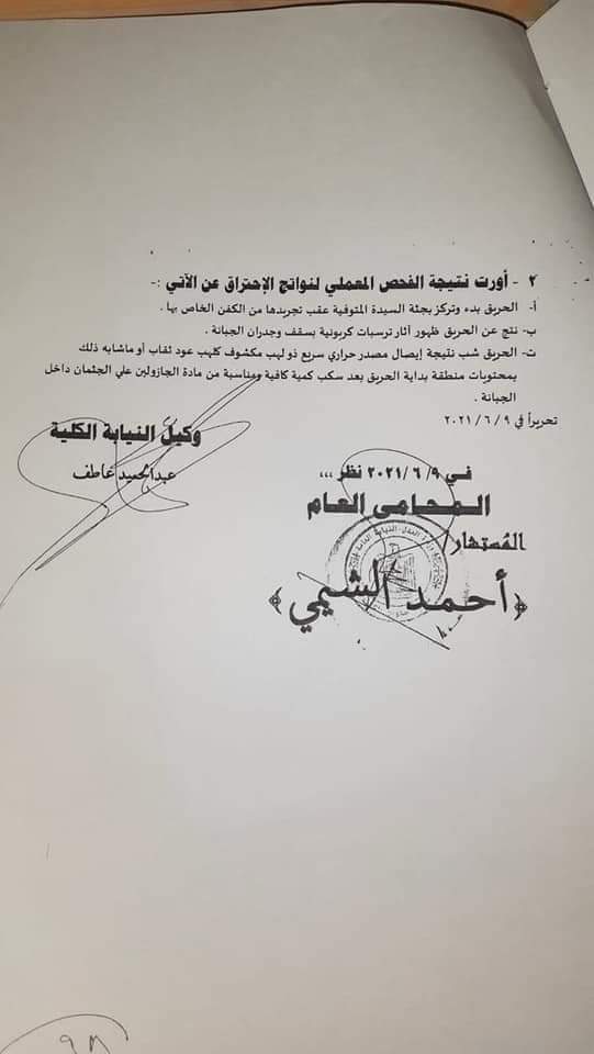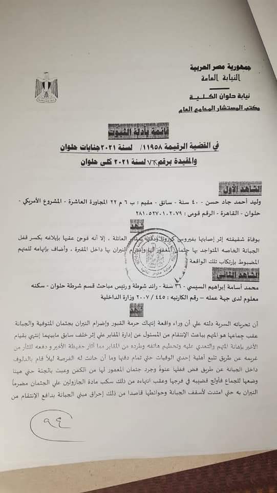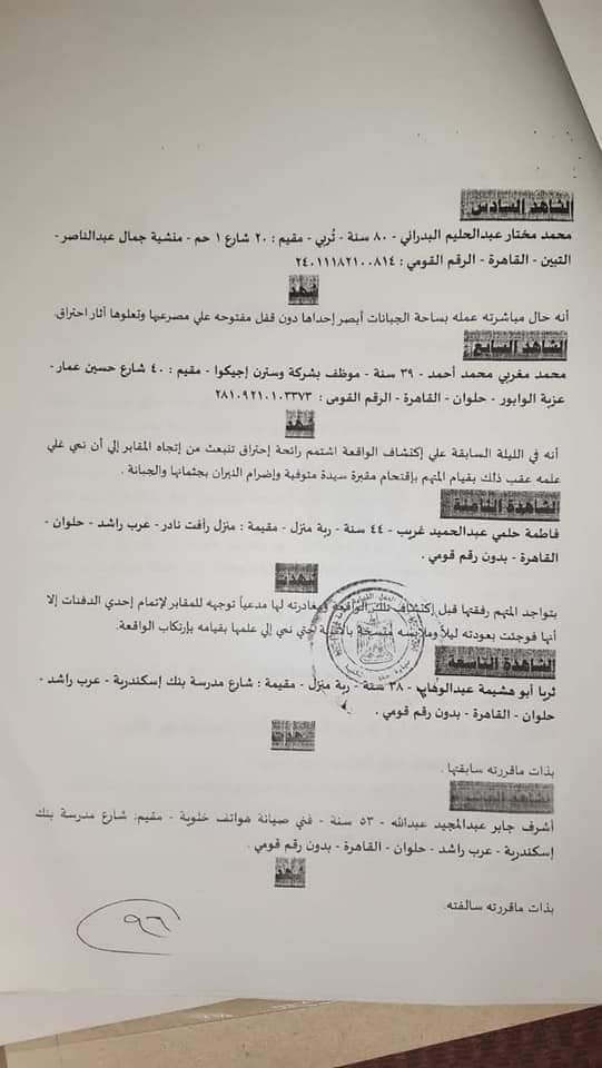 ج: شهد بوفاة شقيقته إثر إصابتها بفيروس كورونا ودفنها بمقابر العائلة إلا انه فوجئ بإبلاغه بكسر قفل الجبانة الخاصة المتواجد بها جثمان المغفور لها واضرام النيران بها داخل المقبرة واضاف باتهامه التربي المضبوط بارتكاب تلك الواقعة.