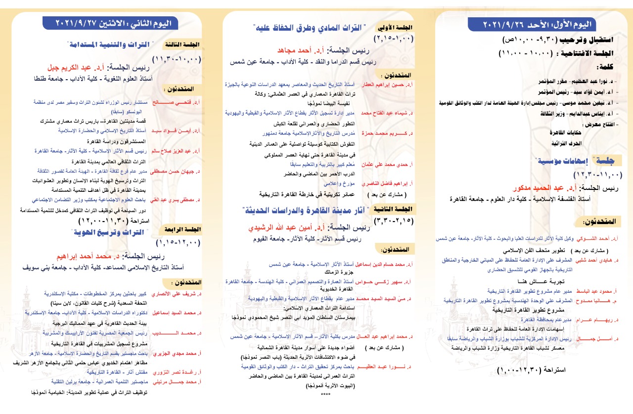 ويعقبها الجلسة الختامية لإعلان التوصيات، ومن الجدير بالذكر أن موضوع هذا المؤتمر يواكب مد إعلان اختيار المنظمة الإسلامية للتربية والعلوم والثقافة القاهرة كعاصمة للثقافة الإسلامية لعام 2022.