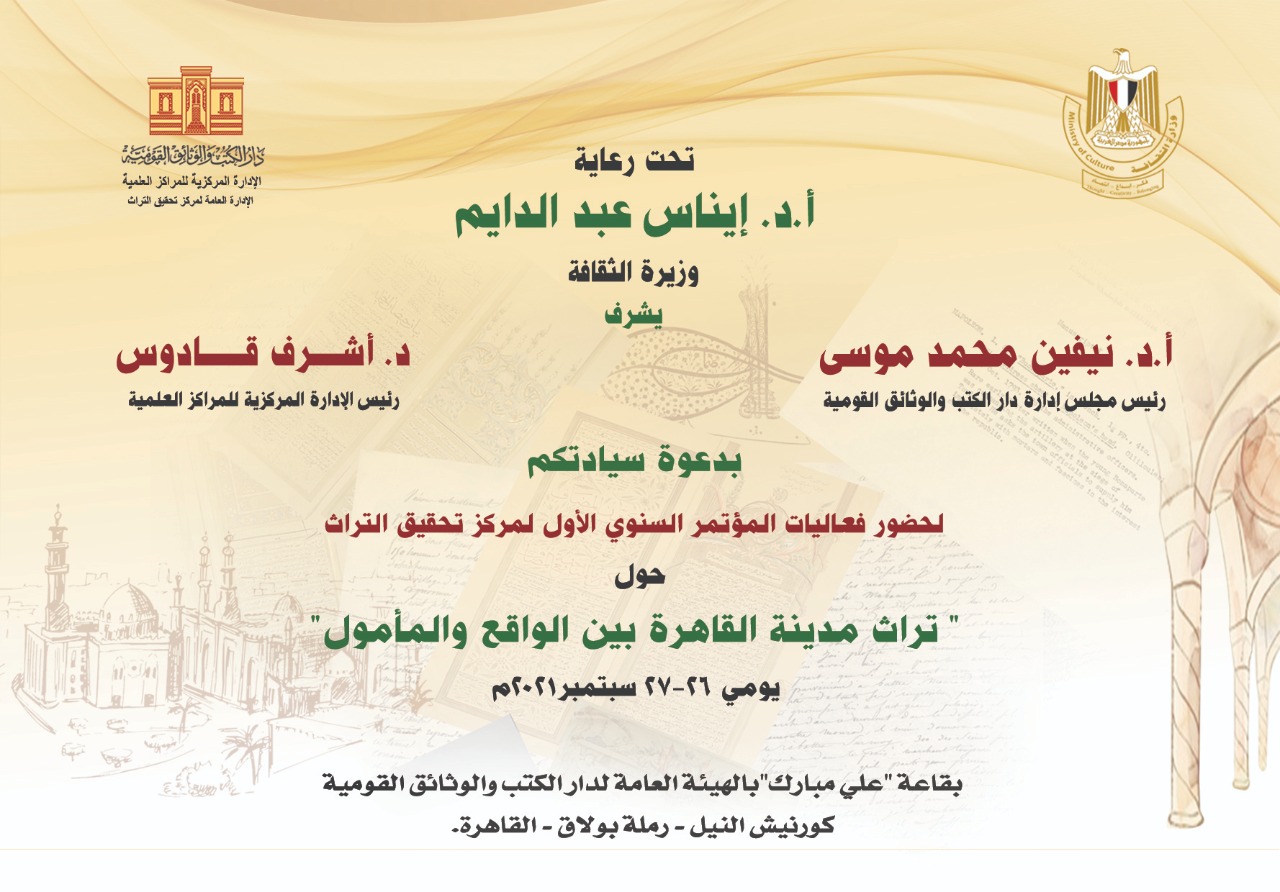 تقيم دار الكتب والوثائق القومية مؤتمرا خاصا، صباح يوم الأحد المقبل الموافق ٢٦ سبتمبر الجاري.. ويعد هذا المؤتمر هو مظاهرة للاحتفاء بتراث مدينة القاهرة العريق.