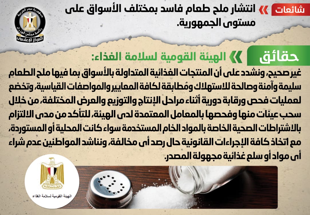 رصد المركز الإعلامي بمجلس الوزراء تداول أنباء بشأن انتشار ملح طعام فاسد بمختلف الأسواق على مستوى الجمهورية، وقد قام المركز الإعلامي لمجلس الوزراء بالتواصل مع الهيئة القومية لسلامة الغذاء، والتي نفت تلك الأنباء.