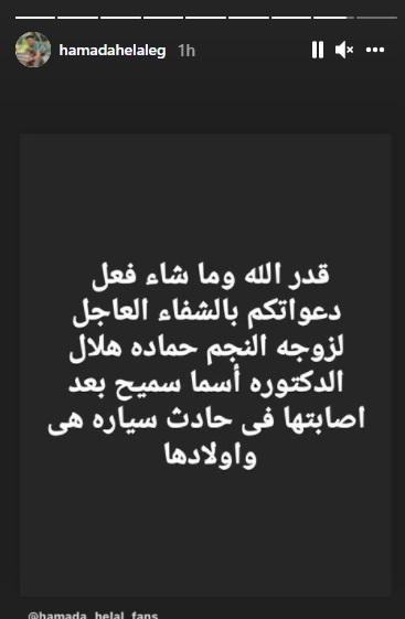 ونشر الفنان حمادة هلال ستوري، عبر حسابه الشخصي بموقع تبادل الصور والفيديوهات إنستجرام، وعلق عليها قائلًا: قدر الله وما شاء فعل، دعواتكم بالشفاء العاجل لزوجة النجم حمادة هلال، الدكتورة أسما سميح بعد إصابتها في حادث سيارة هي وأولادها.