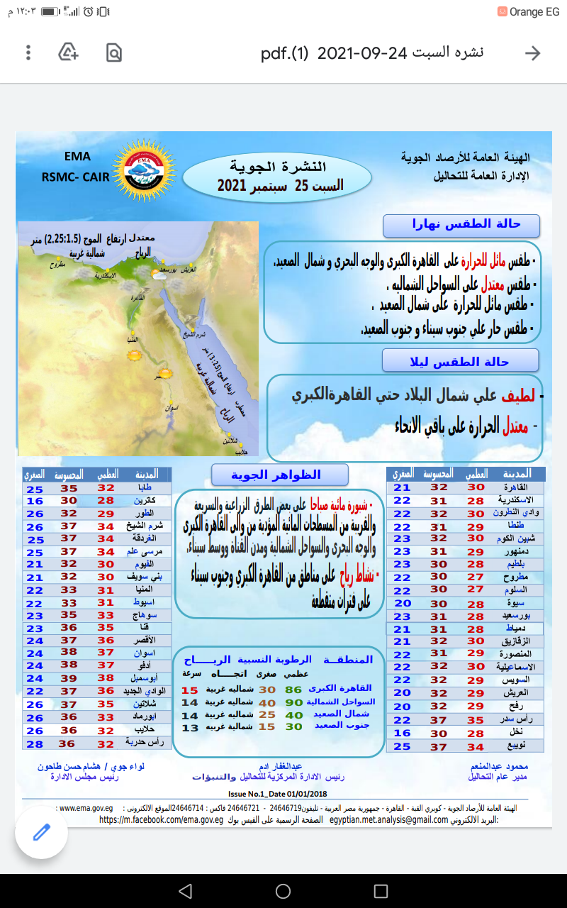 حالة الطقس ودرجات الحرارة غدا السبت 25-9-2021 في مصر