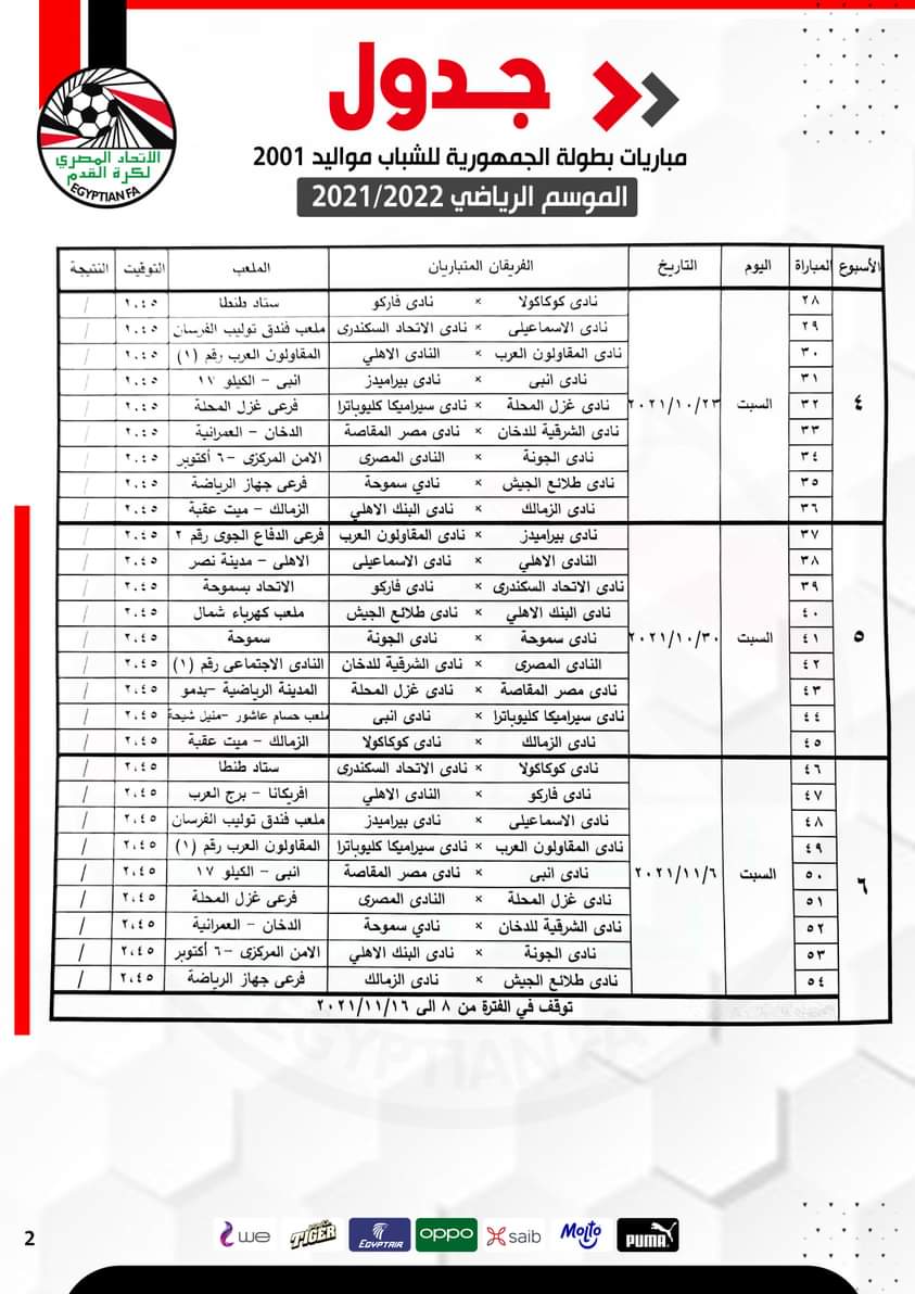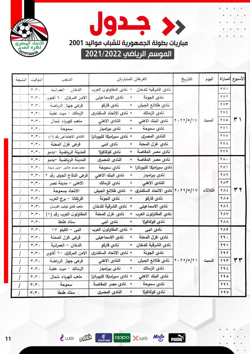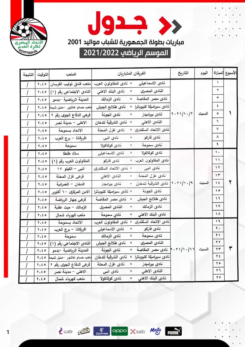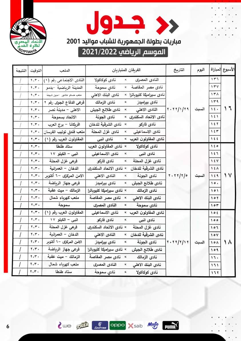 جدول مباريات دوري الجمهورية للشباب مواليد 2001