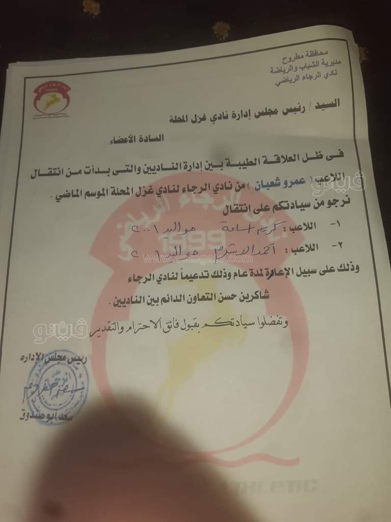 تلقي نادي غزل المحلة فاكسا رسميا من نادي الرجاء المطروحي يطلب فيه نادي الرجاء الحصول علي خدمات الثنائي كريم اسامة واحمد الاشرم ثنائي فريق 2001 بنادي غزل المحلة علي سبيل الاعارة لمدة موسم واحد.