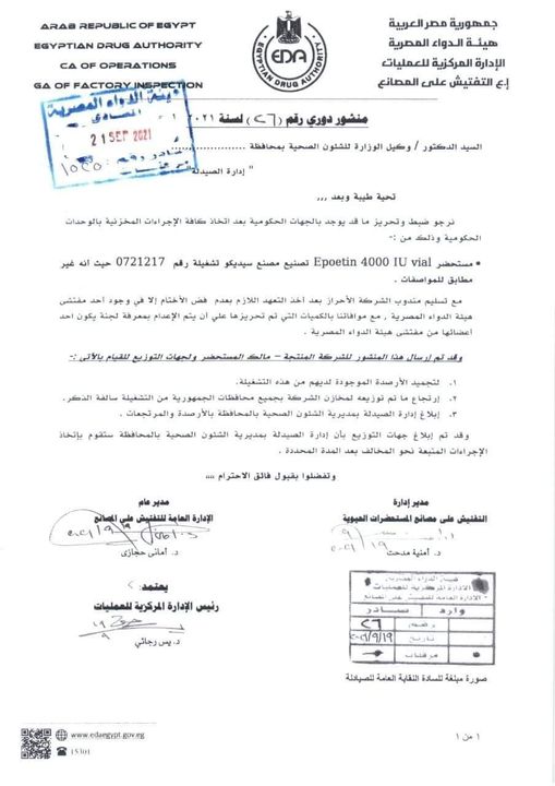 أصدرت هيئة الدواء المصرية منشوراً دورياً رقم ٢٦ لسنة ٢٠٢١ بشأن ضبط وتحريز ما يوجد بالسوق المحلي والوحدات الحكومية من مستحضر ايبوتين ٤٠٠٠ حقن تشغيلة رقم ٠٧٢١٢١٧ لانه غير مطابق للمواصفات.