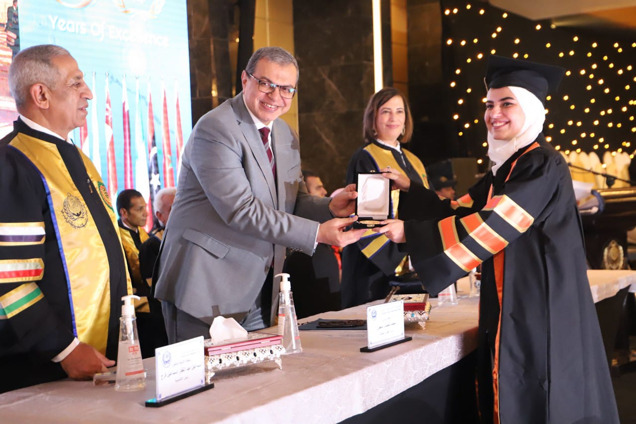 وعبر الوزير، عن سعادته لحضور هذه الاحتفالية، ومشاركة فرحة أبنائنا الطلاب والطالبات الخريجين، مؤكدا أننا نعتز بهم جميعا ونقدر جهدهم وصبرهم، ونعتبرهم نواة لنهضة مصر والدول العربية على كل المستويات، مشيرا إلى أنه ما يزيد من سعادتنا أن هذا التكريم يأتي ليواكب ما يوليه الرئيس عبد الفتاح السيسي، من اهتمام بتنمية قدرات ومهارات الشباب المصري وتمكينهم من الحصول على مستويات علمية وأكاديمية راقية، فهنيئا لشباب مصر والدول العربية من خريجي السودان، والأردن، واليمن، وليبيا، وفلسطين، وهنيئًا لمصر شبابها الذي أثبت للعالم أنه قادر على تحمل المسئولية بعكس ما كان يروج له البعض من دعاة الفتنة والفوضى، ومصدري اليأس والإحباط .